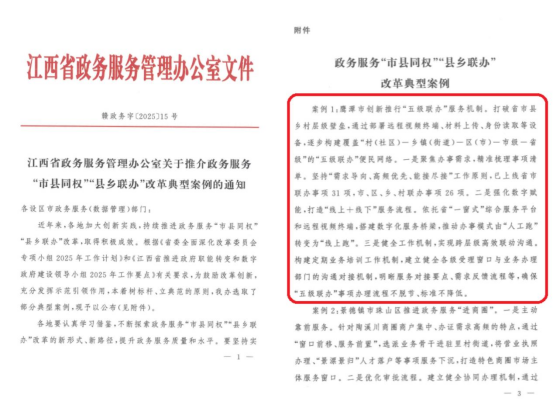 近日,江西省政务服务管理办公室印发《关于推介政务服务“市县同权”“县乡联办”改革典型案例的通知》,三地改革案例脱颖而出。其中,鹰潭市创新推行“五级联办”服务机制做法榜上有名。