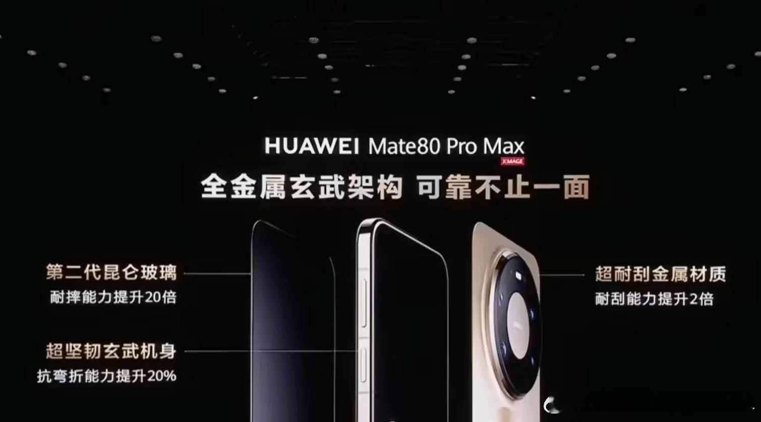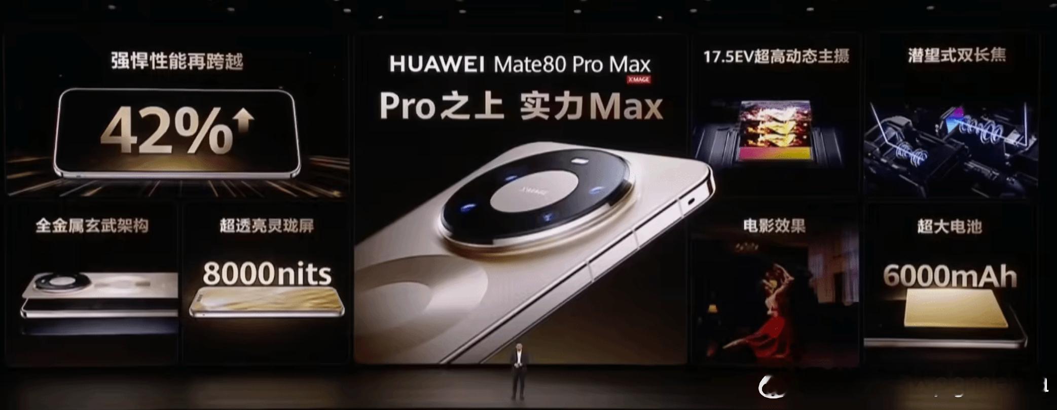 华为Mate 80 Pro Max发布在日前的华为 Mate 80 系列 | Mate X7 及全场景新品线上发布会上,华为 Mate 80 Pro Max 旗舰手机正式发布。新机采用全金属机身 + 光绘微纹 + 双环设计、支持 5A 速度、首发双层 OLED 架构灵珑屏,售价 7999 元起。16GB+512GB:7999 元16GB+1TB:8999 元据华为常务董事、产品投资委员会主任、终端 BG 董事长余承东介绍,华为 Mate 80 Pro Max 采用全金属玄武架构,配备第二代昆仑玻璃、超坚韧玄武机身、超耐刮金属材质,耐摔能力提升 20 倍、抗弯折能力提升 20%、耐刮能力提升 2 倍。华为 Mate 80 系列手机还全系支持 IP69 级抗高温高压喷水、6 米 IP68 级防尘抗水;全系 3D TOF 超精密前置设计,包括 3D ToF 深感摄像头(ToF 接收)、3D ToF 深感摄像头(ToF 发射)、前置摄像头 | AI 姿态感应器。华为 Mate 80 Pro Max 手机业界首发搭载双层 OLED 架构的灵珑屏,是业界最亮的手机屏,拥有业界最高 1% APL 峰值亮度 8000nits。华为 Mate 80 系列内置方舟图形引擎,操作流畅度对比 Mate 70 系列提升 45%、加载速度对比 Mate 70 系列提升 34%;支持 3DGS 渲染加速,对比 Mate 70 系列提升 33%;支持光线追踪硬加速,每秒光线渲染 2000 万条。华为 Mate 80 Pro Max 行业首发超冷双相变散热系统,是业界通信功能集成度最高的智能手机。新机还支持蜂窝通信、WiFi 7+(地网);支持天通卫星通信、北斗卫星消息(天网);支持无网 700MHz 无网应急通信、2.4GHz 畅连无网通信(无网)。华为 Mate 80 系列首发第二代红枫影像。华为 Mate 80 Pro Max 搭载第二代红枫原色摄像头,进光量提升 96%(2.45um 超大像素尺寸)、超高动态范围提升 300%(DCG 双重实时融合技术)、超精细光谱感知提升 25%(4×4 创新光谱阵列)。华为 Mate 80 Pro Max 还搭载 17.5EV 超高动态主摄(5000 万像素 1/1.28" 大底 F1.4-F4.0 十档可变光圈 RYYB)、超广角摄像头(4000 万像素 F2.2 RYYB)、4x 光学微距长焦(5000 万像素 F2.1 大光圈 OIS RYYB)、6.2x 光学超长焦 +12.4x 光学品质变焦(5000 万像素 F3.2 OIS RYYB)。华为 Mate 80 还拥有专业影像套装,内置 3.3x 增倍镜和快拆拓展配件。华为 Mate 80 Pro Max 手机首发搭载鸿蒙 HarmonyOS 6 操作系统,带来全新沉浸光感效果,拥有交互灵动粒子、通透质感材质、气态动效变化等;内置鸿蒙 AI,覆盖效率、交互、影像、安全等场景。华为 Mate 80 系列手机还带来了 HUAWEI HiPlay 新一代无线流媒体技术,支持超清母带音质。