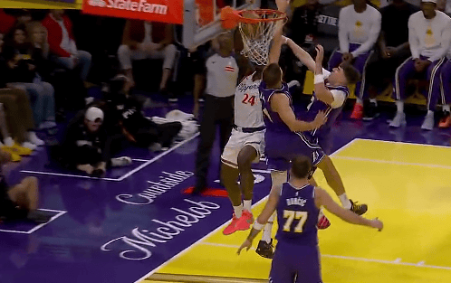第一节比赛中,科比-布朗突破迎着拉拉维亚和克勒贝尔两人上演炸裂隔扣。