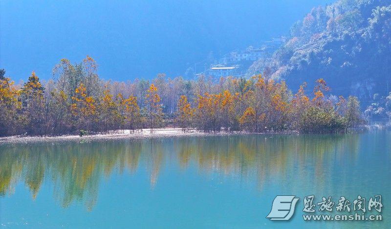 11月21日,恩施市屯堡乡新街村,清江河畔水杉橙黄相间,倒映在翡翠般的河水中,与远山、村落构成一幅美丽的山水画卷。