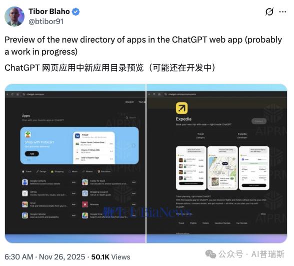 从开发者TiborBlaho晒出的图片来看,新版目录以卡片形式呈现来自不同开发者的AI应用,如ShopwithInstacart、Kroger、FictionWriting、CodeforSlack、Expedia等,覆盖购物、生产力、教育、旅行等多个场景。用户可直接在ChatGPT内完成调用,实现“即点即用”的App内联体验。