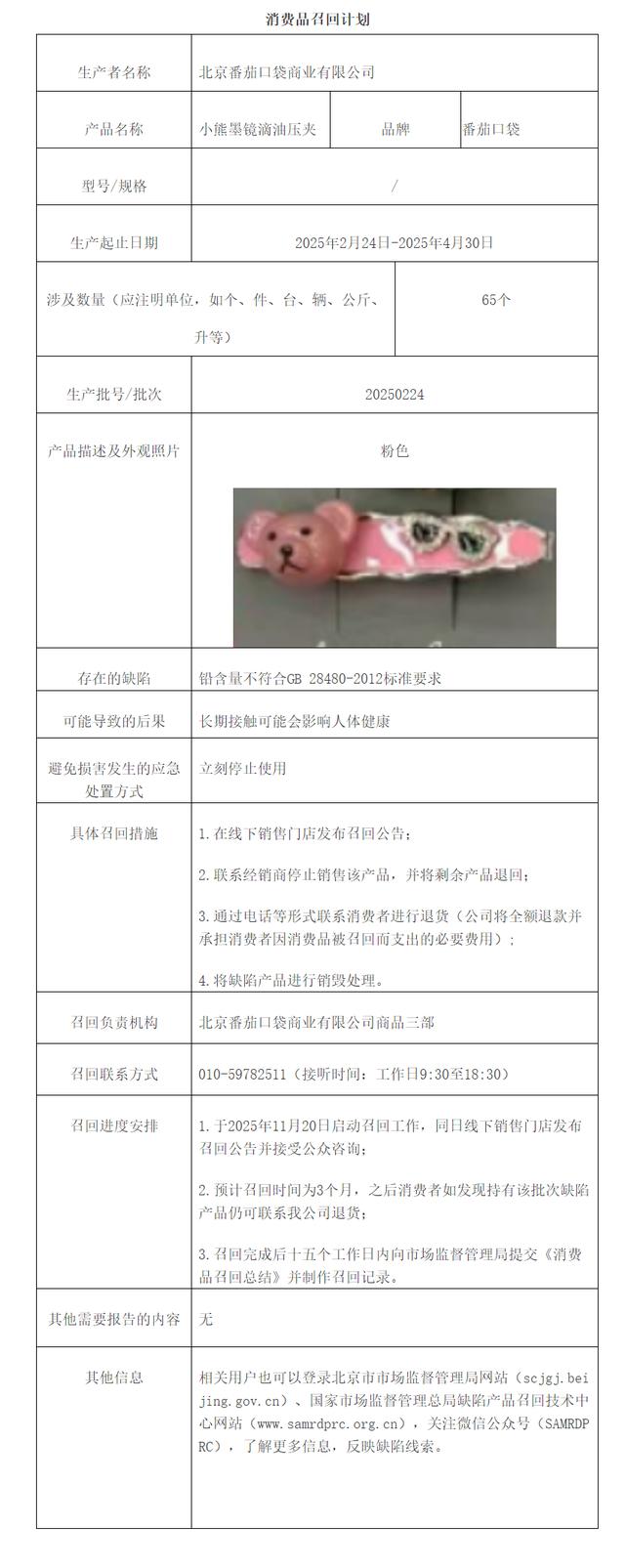 近日,北京番茄口袋商业有限公司向北京市市场监管局报告召回计划,召回2025年2月24日至2025年4月30日生产的小熊墨镜滴油压夹,涉及数量为65个。召回产品铅含量不符合GB28480-2012标准要求,长期接触可能会影响人体健康。