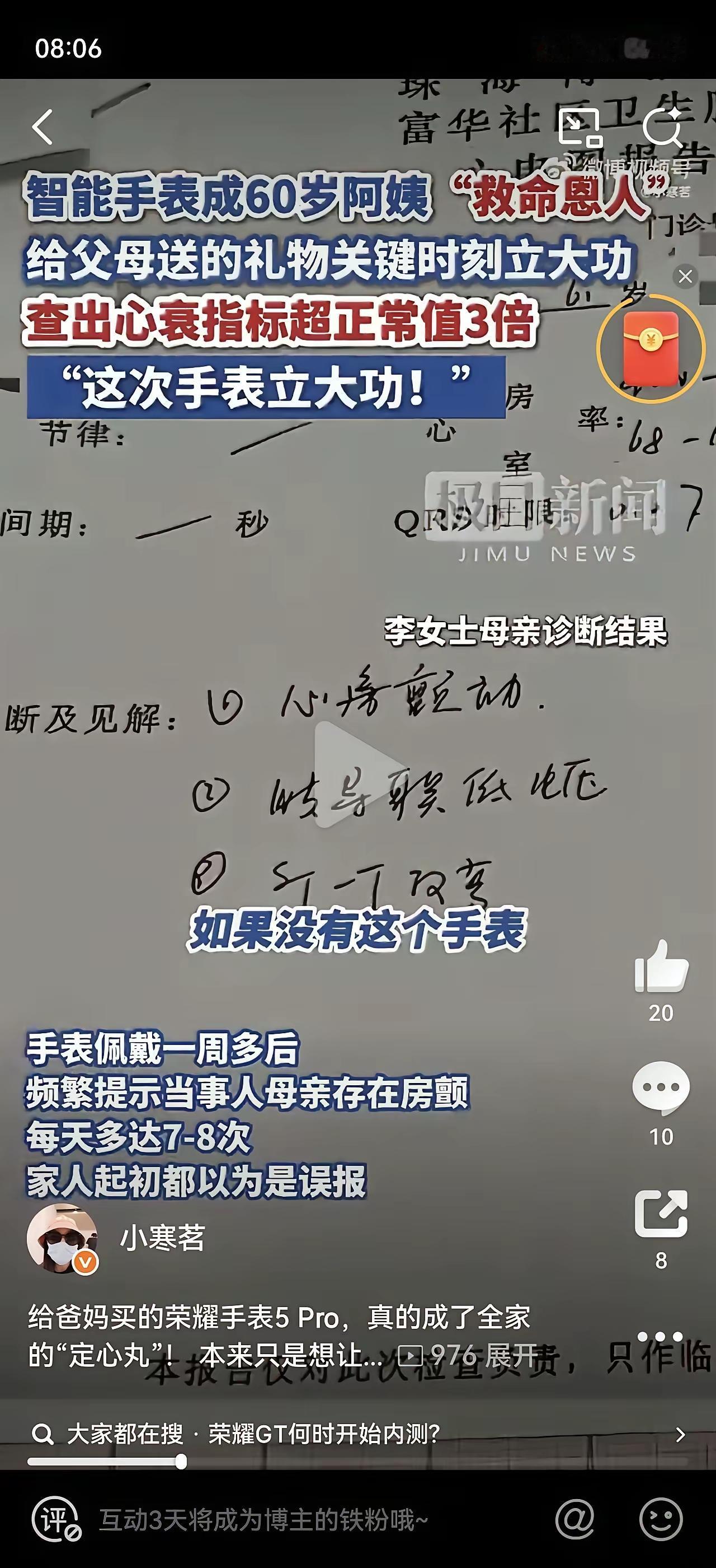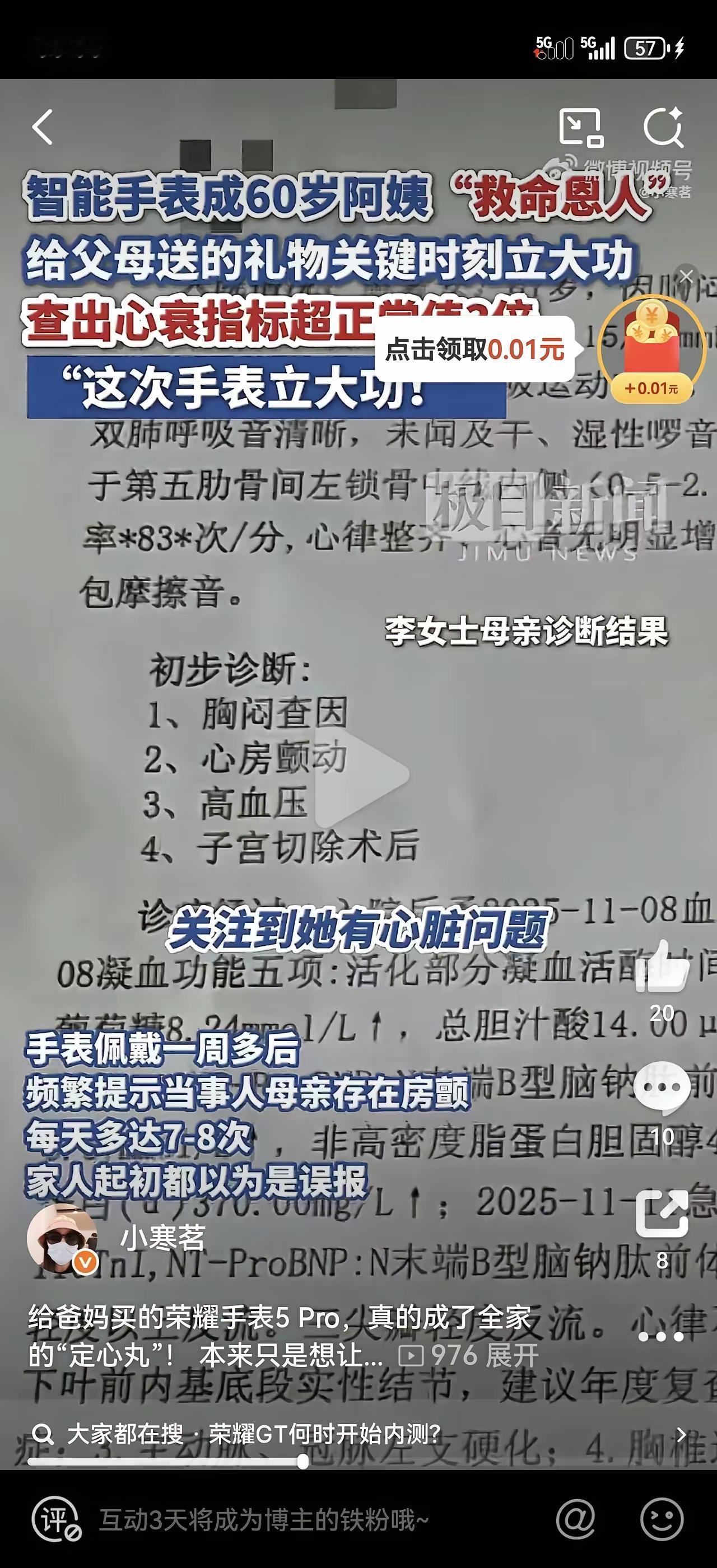 看到一位网友分享她送给妈妈的荣耀手表5 Pro,使用一段时间后,却发现了一个意外情况。 当初买这块表,只是想方便长辈平时检测血压、心率等健康指标。有一天,戴着在妈妈的手表突然持续发出房颤提醒,起初妈妈并未在意。当妈妈跟她说起提起这件事,她在买表就了解到荣耀手表5 Pro搭载了创新的“灵瞳感知系统”,能够精准捕捉血流信号,监测心率、血压、血氧等健康数据。 于是,她带妈妈去医院检查,结果真的发现心脏存在问题。 她不禁感叹,幸亏荣耀手表5 Pro及时提醒,智能穿戴设备真的能在日常生活中为健康保驾护航。