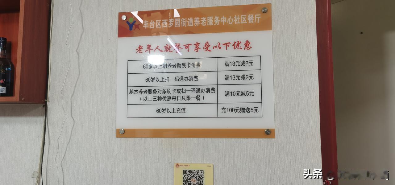 中午,在一个小区看到了一个老年食堂。实际上是一个餐馆隔出了一块地方,个人觉得这种方法比较好,光是老年食堂的话,很难支撑得住。这种只要政府给一定的补贴。餐馆也是愿意开展这项业务的。 价格一荤一素是15,一荤两素18,两荤一素是22。都含主食(面食、米饭)和汤。这个价格在北京应该还算可以,一个老人,一个月1000块钱左右,完全没问题。比自己做方便省事,比请保姆就更便宜多了。