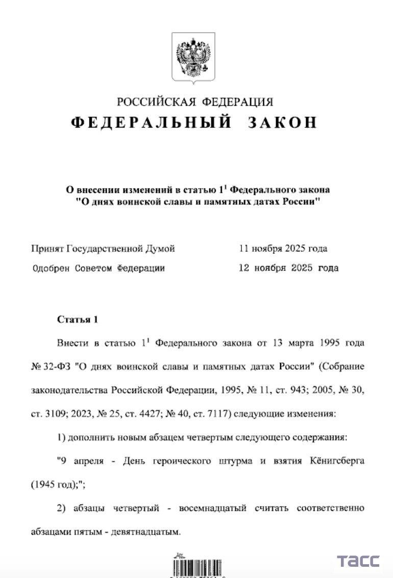 【普京签署法令设立攻克柯尼斯堡纪念日】俄总统普京签署法令,将每年4月9日定为俄罗斯新的纪念日──英勇突袭及攻克柯尼斯堡纪念日。 要塞城市柯尼斯堡要(今加里宁格勒)在1945年东普鲁士战役中被苏军攻克。攻城战于4月6日打响,守城德军司令部于4月9日下令停止抵抗。 苏军在柯尼斯堡战役中俘获近9.4万名德军士兵,缴获2000余门火炮、1652门迫击炮及128架飞机。据不同统计,苏军在此战中阵亡人数约为7000至7500人。柯尼斯堡战役是二战末期红军最重要的决胜战役之一。