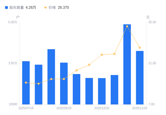 日期A股户数(户)流通A股户均持股数(股)户均持股市值(万元)2025-11-20426055419.7314.292025-11-10587923927.5413.222025-10-31279348266.1920.032025-10-20260408867.4221.262025-10-10261198840.6018.142025-09-30285008102.0215.092025-09-19354416515.2710.222025-08-08436175330.348.352025-07-31342196794.279.572025-07-18363246400.549.24