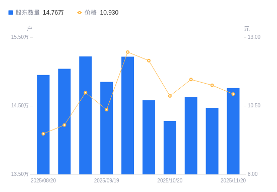 日期A股户数(户)流通A股户均持股数(股)户均持股市值(万元)2025-11-1014470017802.4920.032025-10-3114630017607.8020.182025-10-2014280018039.3619.592025-10-1014580017668.1821.472025-09-3015216816928.7921.092025-09-1914850017346.9417.972025-09-1015220016925.2318.582025-08-2915040017127.8016.792025-08-2014950017230.9116.332025-08-0815150017003.4415.37
