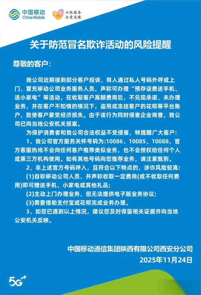 我公司近期接到部分客户投诉,有人通过私人号码外呼或上门,冒充移动公司业务服务人员,声称可办理“预存话费送手机、送小家电”等活动,在收取客户高额费用后,不兑现承诺、未办理业务,并在客户不知情的情况下,盗用或冻结客户的花呗等平台账户,致使客户蒙受经济损失。由于该行为同时侵害企业商誉,我公司已向当地公安机关报案。