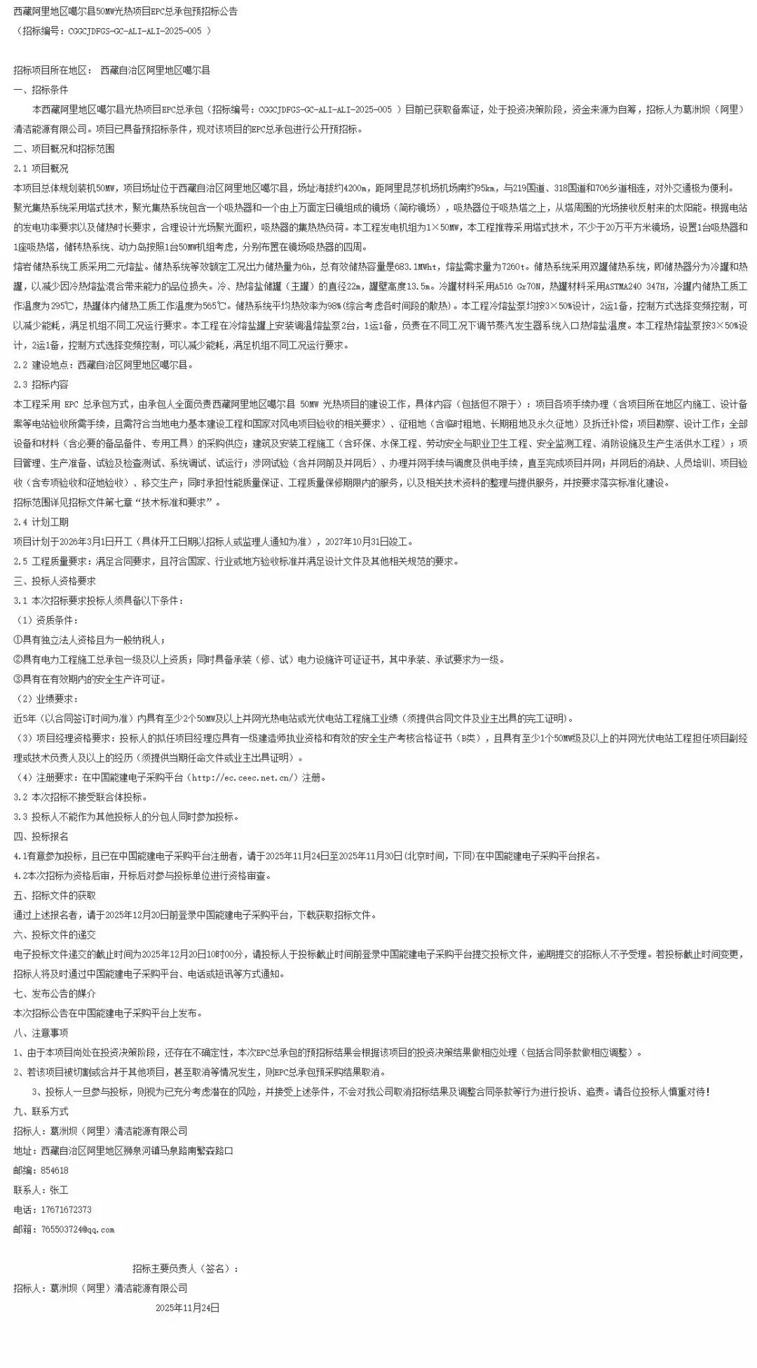 招标内容:本工程采用EPC总承包方式,由承包人全面负责西藏阿里地区噶尔县50MW光热项目的建设工作,具体内容(包括但不限于):