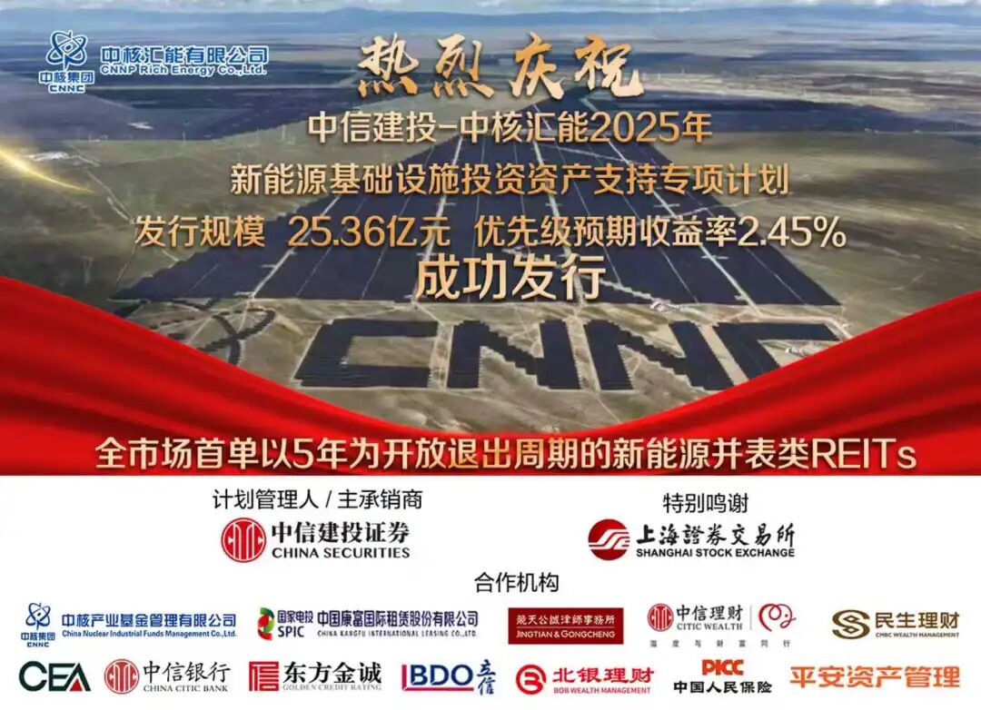 2025年11月26日,中信建投-中核汇能2025年新能源基础设施投资资产支持专项计划成功定价,中信建投证券担任计划管理人及销售机构。该项目发行规模25.36亿元,优先级预期收益率2.45%,期限22年(5+5+5+5+2),评级AAAsf。本项目是全市场首单以5年为开放退出周期的新能源并表类REITs!