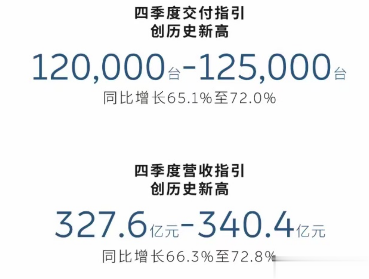 不过,尽管三季度业绩亮眼,但蔚来对四季度的展望却低于市场预期。蔚来预计,四季度交付量为12万-12.5万辆,同比增长65.1%-72.0%。