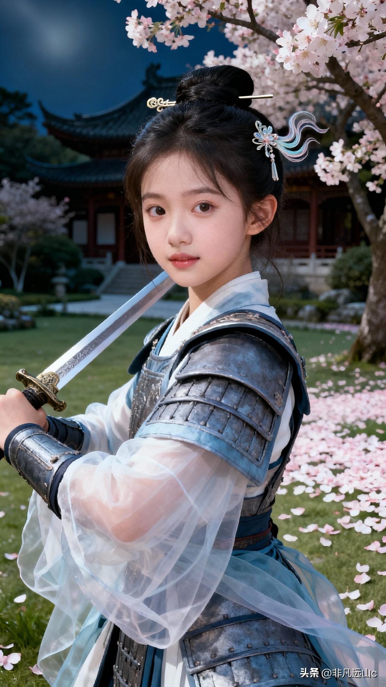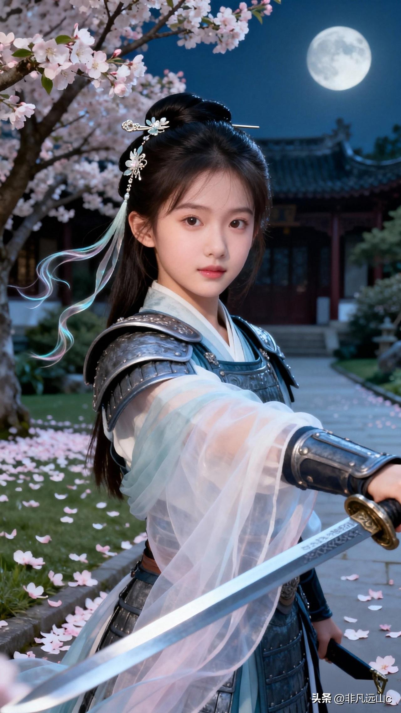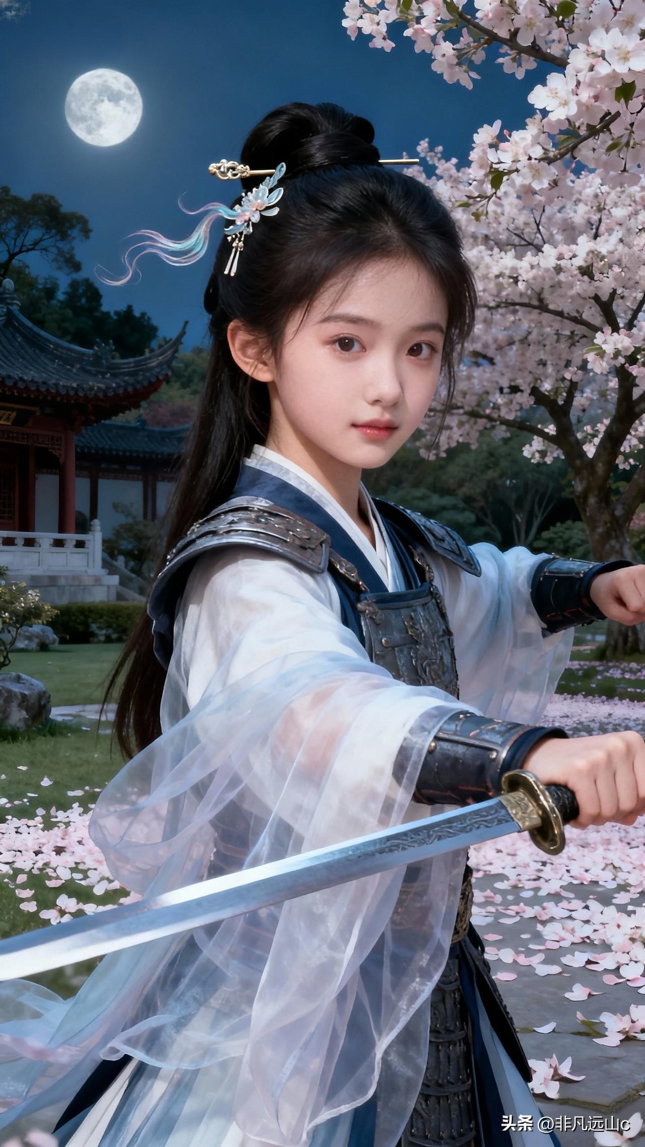 月光下,少女手持长剑,古风唯美,如梦如幻。持剑女子漫画图 带剑女孩