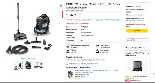 “美国亚马逊”平台显示,同型号RainbowRHCS19吸尘器售价1569美元