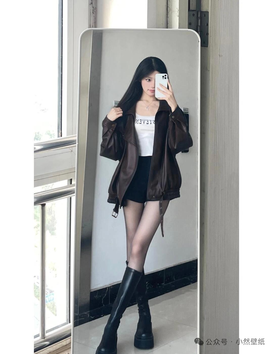 皮质外套+短裙,搭配黑色靴子,简约又帅气!👗👢