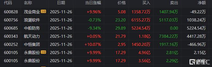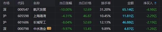 龙虎榜单日净卖出额前三为航天发展、上海港湾、长城军工,分别诶4.98亿元、2.29亿元、2.19亿元。