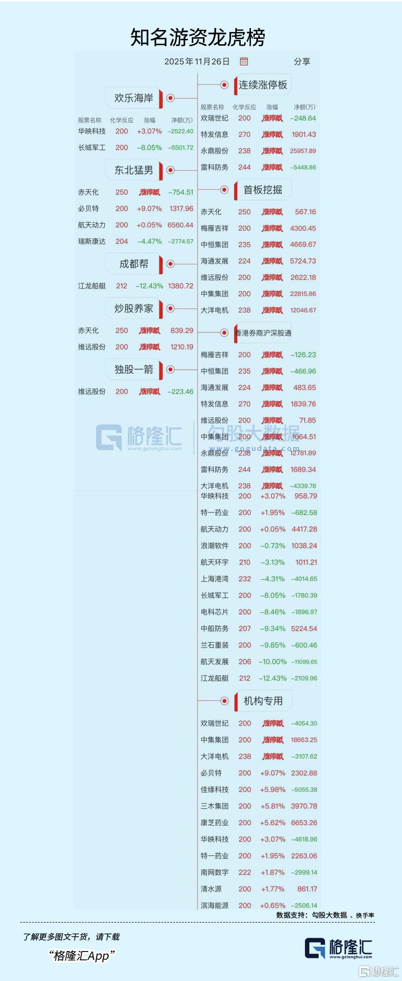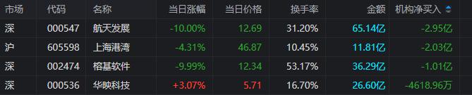 龙虎榜中涉及机构专用席位的个股中,单日净卖出额前三为航天发展、上海港湾、榕基软件,分别为2.95亿元、2.03亿元、1.01亿元。