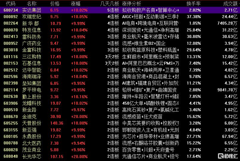 焦点股方面,AI应用概念股实达集团5连板、新华都4连板,谷歌产业链的特发信息4连板,游戏股欢瑞世纪4连板。