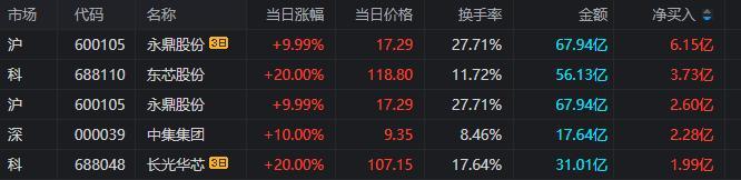 龙虎榜单日净买入额前三为东芯股份、永鼎股份、中集集团,分别为3.73亿元、2.60亿元、2.28亿元。