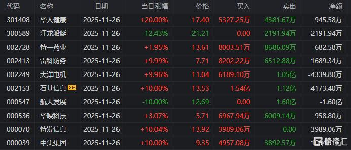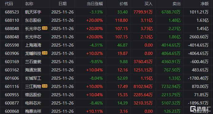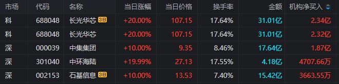 龙虎榜中涉及机构专用席位的个股中,当日净买入额前三为长光华芯、中集集团、中环海陆,分别为2.32亿元、1.87亿元、4707.66万元。