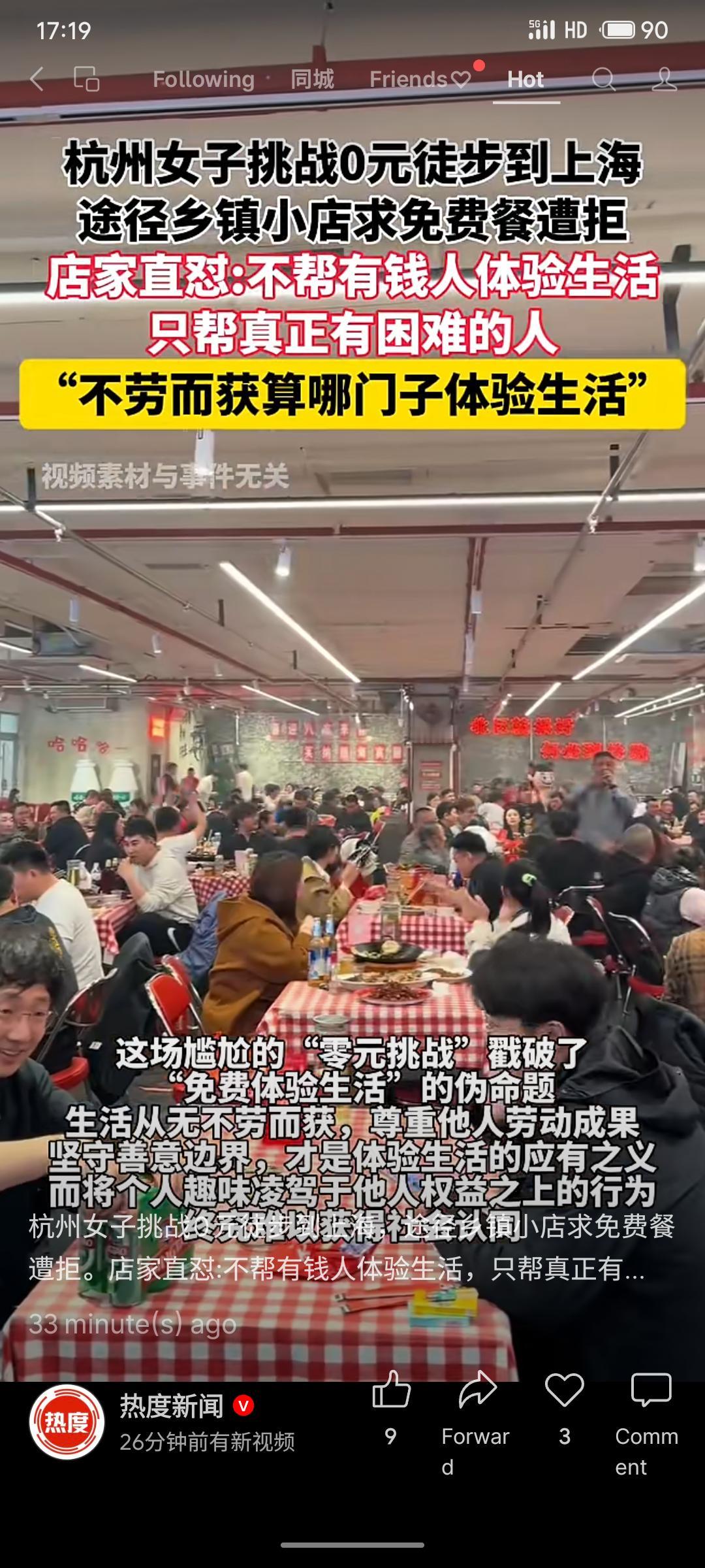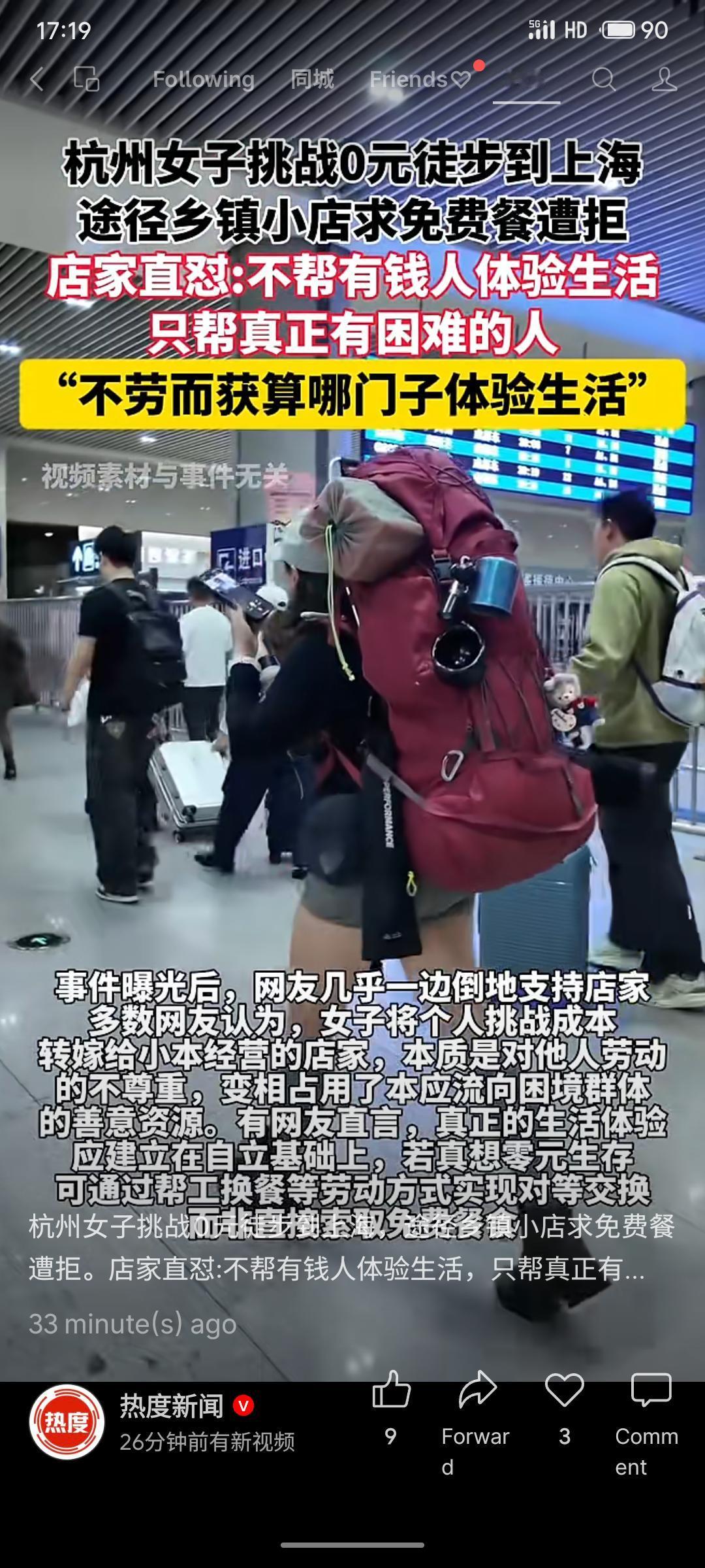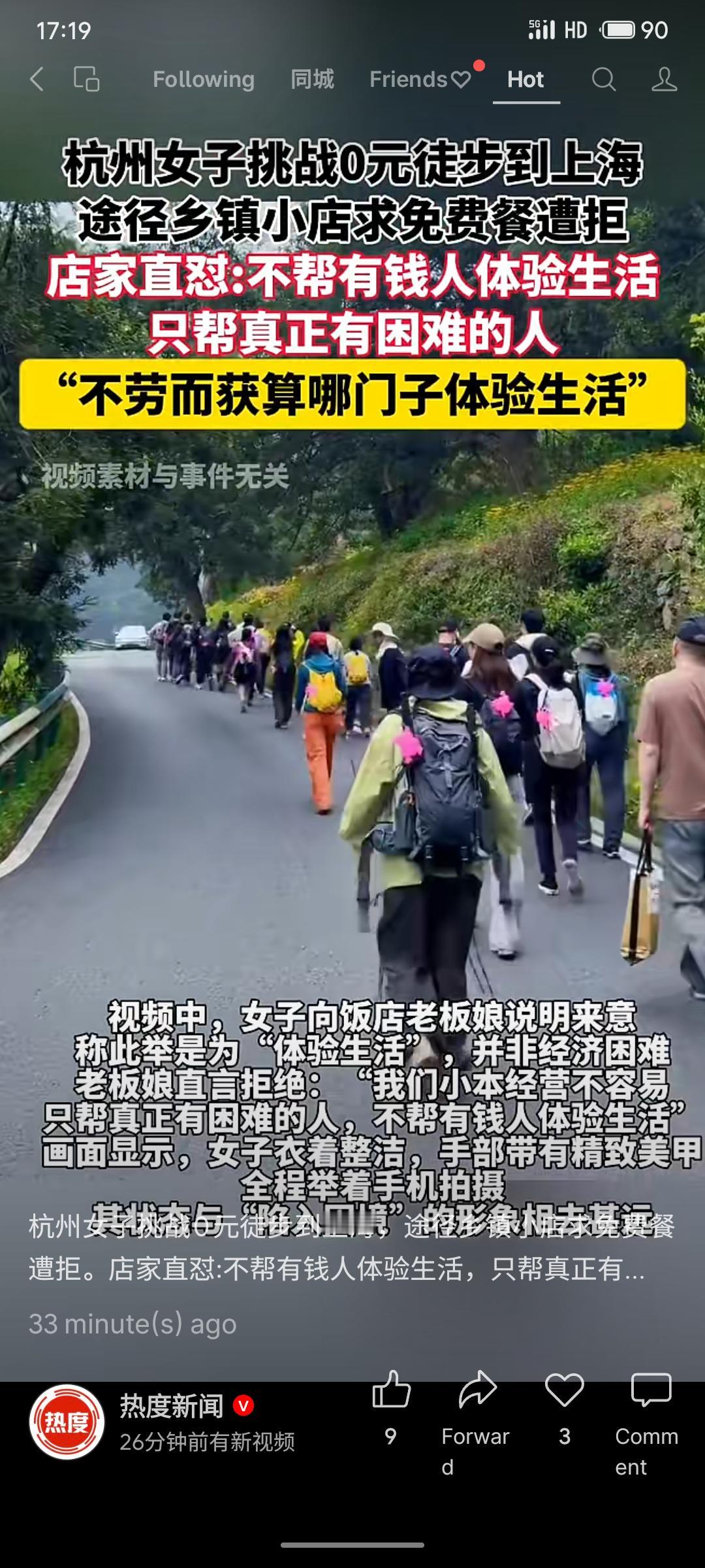 杭州一女子发起“0元徒步上海”挑战,途中向乡镇小店求免费餐遭拒。店主直言只帮助真