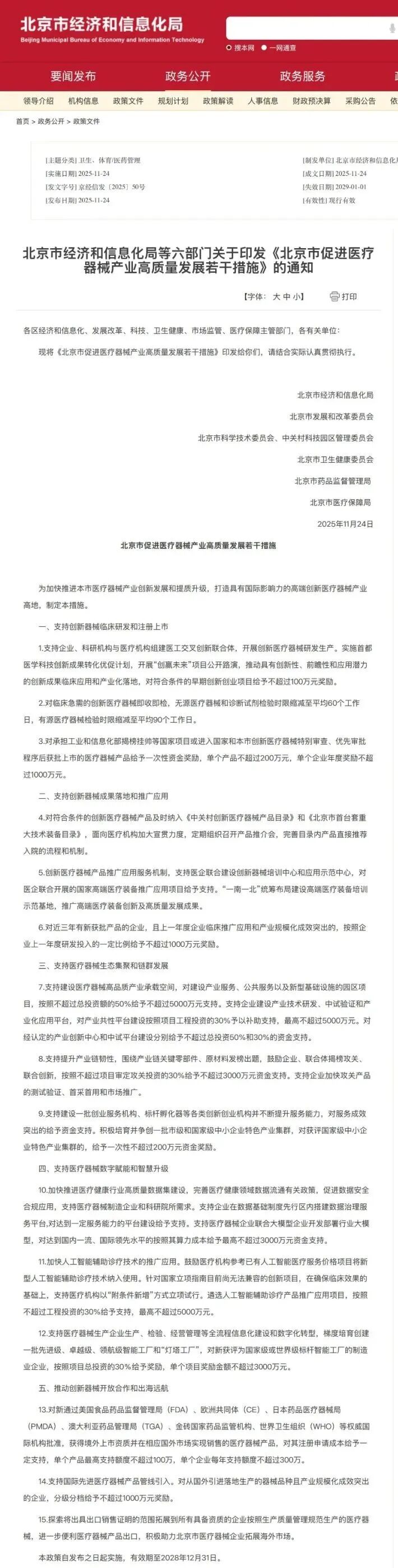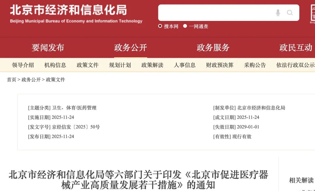 11月24日,北京市经济和信息化局、北京市卫健委等六部门联合发布《北京市促进医疗器械产业高质量发展若干措施》的通知(完整见文末),自发布之日起实施,有效期至2028年12月31日。