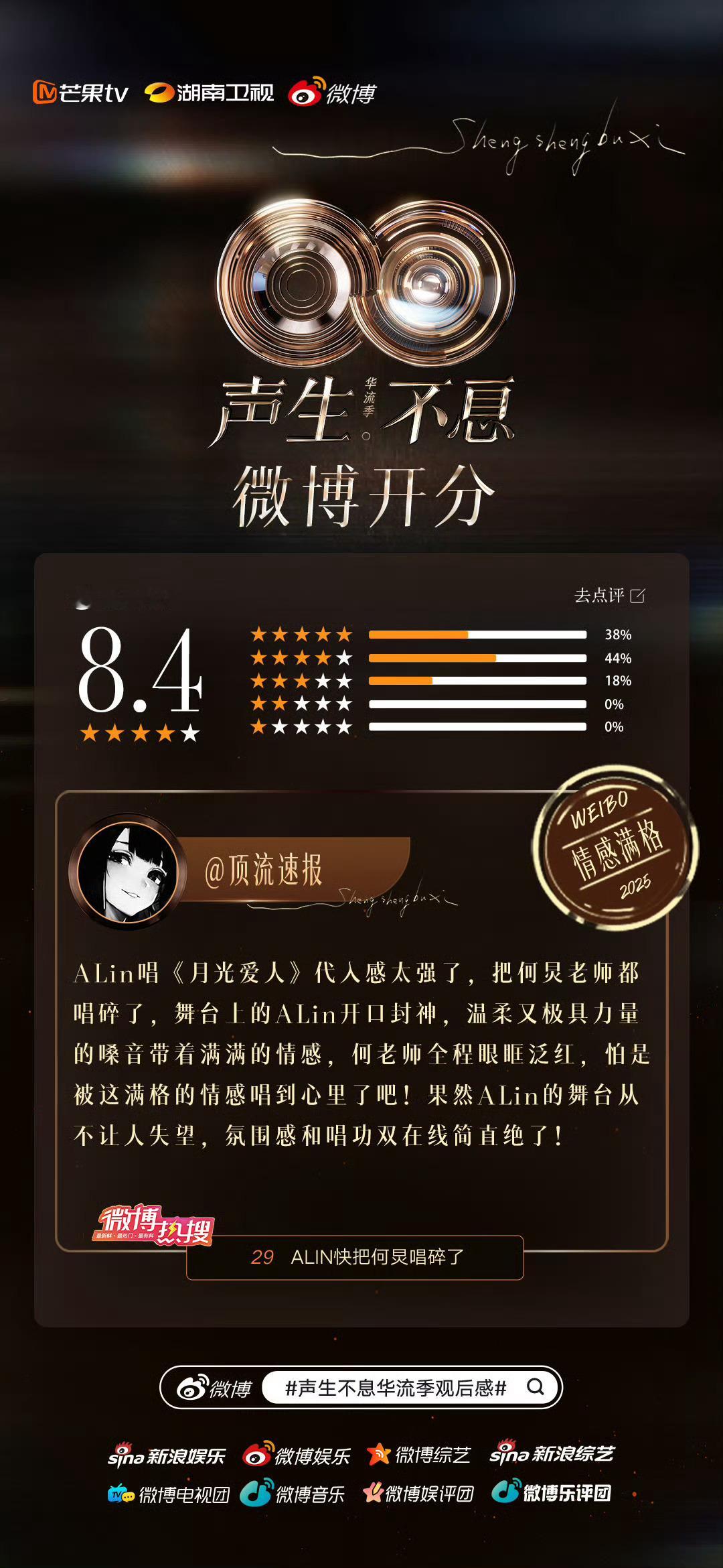 声生不息华流季微博开分8.4 恭喜《声生不息 》微博开分8.4分两岸三地带来的经典华流歌曲真的对我耳朵很好声生不息华流季