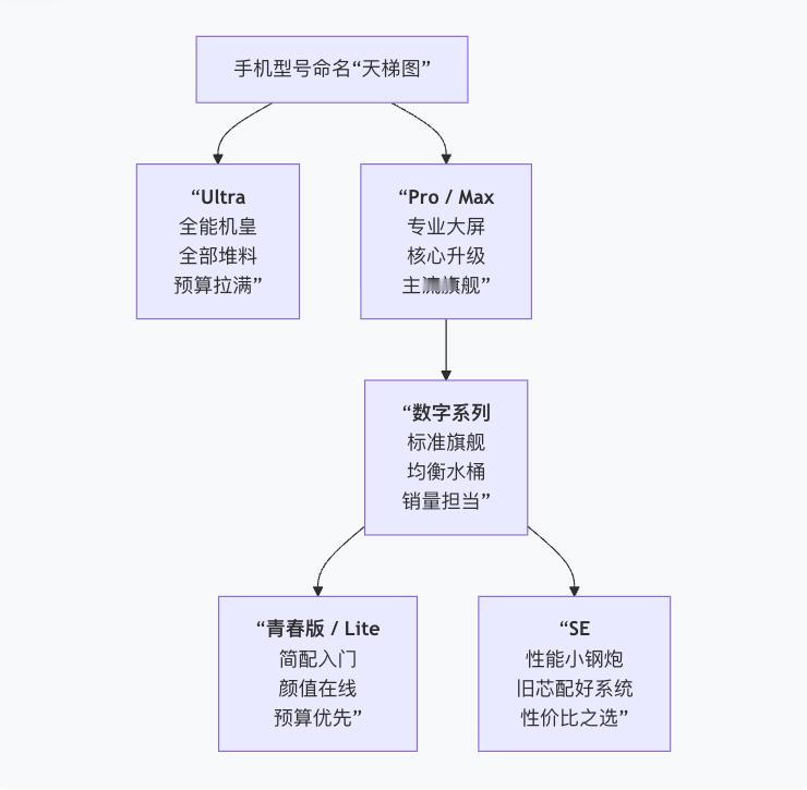 手机命名是不是太复杂了 命名看似眼花缭乱,其实背后就那几招,看了一下机圈的命名就那几个:数字系列、Pro、Ultra、SE...Pro/Max专业版,苹果用的最多,现在部分安卓和鸿蒙超大杯也会用Pro Max,基本上就是自家的旗舰了,当下品牌最高定位,价格也是最贵的。Ultra:机皇。堆料到顶,所有最好的技术都给你塞进去,通常是预算充足或重度玩家的选择。基本只有安卓在用,和苹果的Pro Max定位一样,超大杯。SE:特别版。听着好听,其实是做减法,常用功能保留,但在屏幕、摄像头或材质上控制成本,主打一个性价比。苹果那边通常是清库存抢占低价位市场的产品...其他后缀...Plus/Max:大屏版。除了屏幕和电池更大,其他配置通常与标准版一致。Lite/青春版:简配版。比SE还要再降一档,性能足够日常使用。T/S:小升级款。外观不变,核心芯片或某个功能小幅提升,可以看作是“半代更新”。数字越大,版本越新;后缀越多,定位越细分。说到底,套命名法是厂商的价格锚点和营销话术,目的就是让用户对号入座。下次看手机,别光看名字花哨,直接对比芯片、影像、屏幕这核心三件套,看硬参数才是最实在的,不然就看价格,更直观hhh