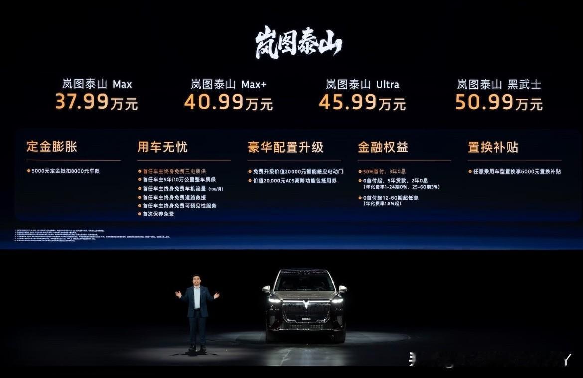 👏👏不知不觉,从东风系孵化出来的高端电动和品牌岚图汽车,已经在这片动荡的市场上厮杀了四年有余。生于乱世的岚图,非但没有被轻易打倒,反而在残酷的市场下,越战越勇,今年上半年销量同比增长了97%,可以说是含金量满满。 尤其是岚图泰山用实力说话——同级最大、同级领先、同级首发,每一项都是对“旗舰”二字的极致诠释! 先说说外观,看实车照片确实挺大气的,直瀑式的大嘴格栅看着很有气势,不像有些车设计得过于花哨,这种方正稳重的风格,不管是家用还是偶尔商务 用都挺合适。车身尺寸不小,轴距超过三米一,侧面线条规整,半隐藏式门把手和大饼轮毂的搭配,看着 简洁又显质感,尾灯晚上亮起来应该挺醒目,整体就是那种耐看型,越看越有味道。 座舱以“山海万象”为核心,融入山水意境装饰元素,86.8%得房率实现“每个座位皆为主座”。3120mm轴距带来宽敞空间,第二排180mm宽适通道+纯平地台方便进出第三排,魔术折叠第三排可灵活切换6/5/4座布局,后备厢容积305L-1193L。 科技配置是泰山更大卖点。在华为赋能下,它搭载基于全新WEWA技术架构的华为乾崑辅助驾驶ADS 4系统,有34个感知智慧传感器,功能丰富,若体验流畅,将树立辅助驾驶新标杆。 岚图泰山国内首搭三腔空悬,配合EDC魔毯功能,实现悬架多维度调节与毫秒级路况响应,驾乘平顺性与操控性达到旗舰水准。 总的看下来,37.99万起的售价给足诚意,泰山的华为全家桶加上底盘悬架黑科技,对于喜欢华系的车主来说,配置一步给到位了