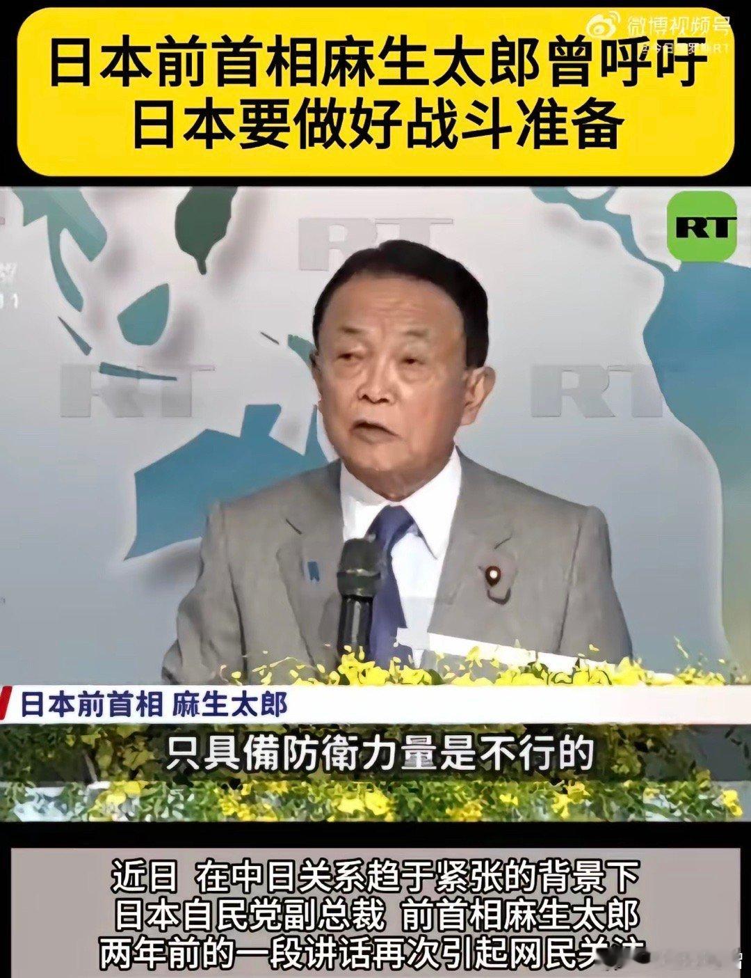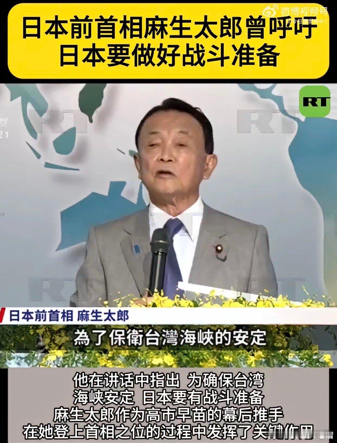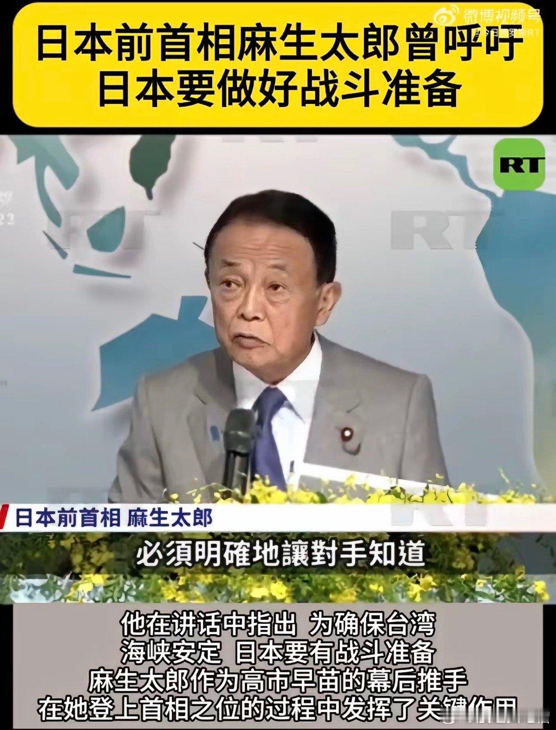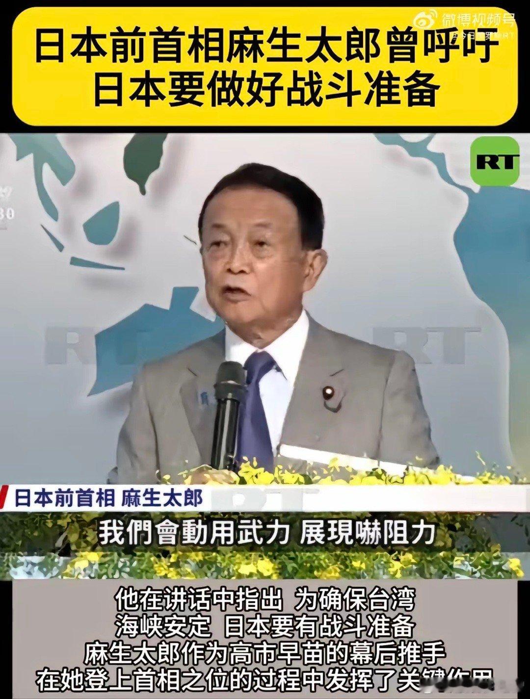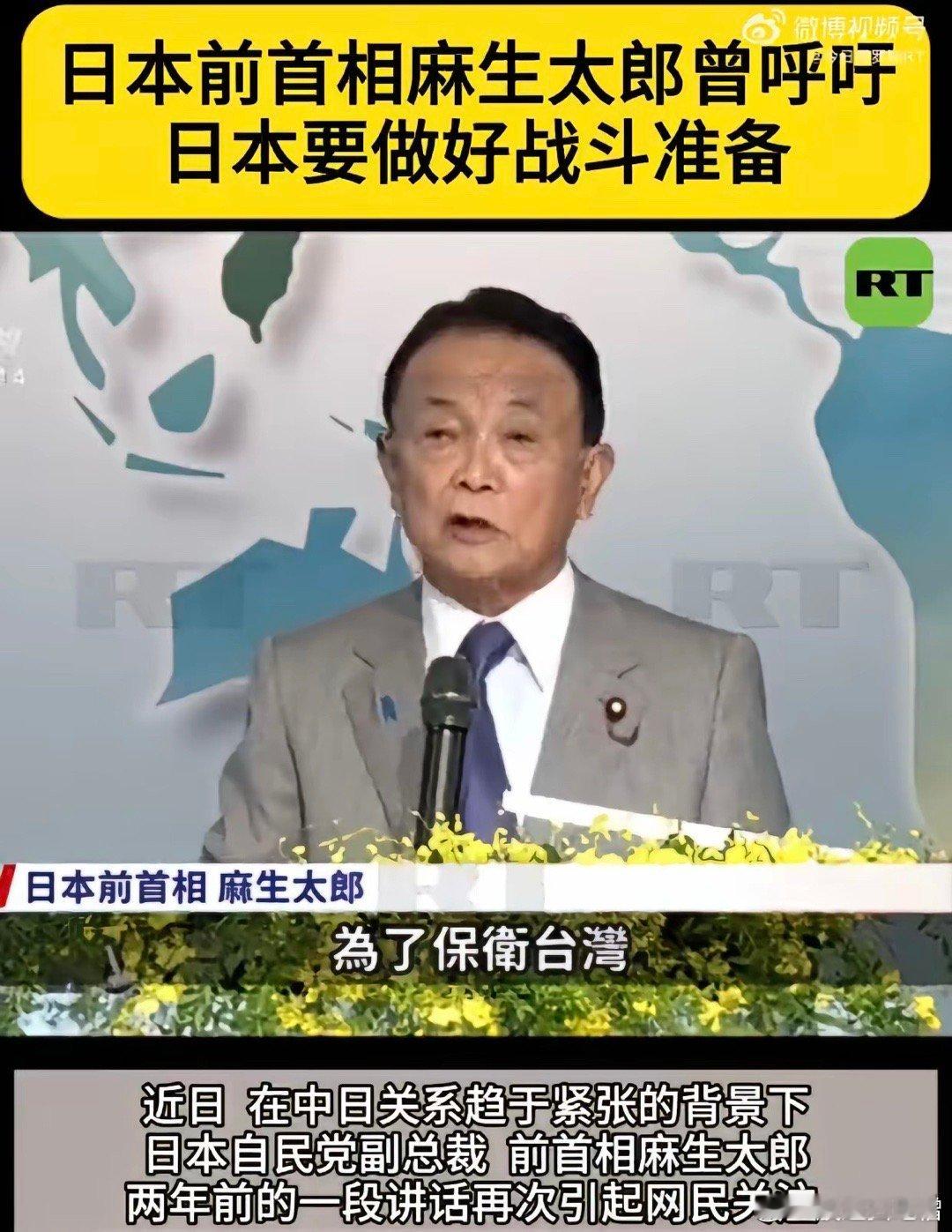 日本前首相麻生太郎表示:日本必须要有准备战斗的心理准备,日本只具备防卫能力是不行的,为了保卫台湾,为了保卫台湾海峡的安定,日本必须明确地让对手知道,日本是会动用武力的,日本要展现威慑力!以麻生太郎为代表的日本人如果太过于高估自己,妄图以武力介入台海问题,那会变成“日本有事就是日本有事” ,从而将日本本土卷入到战争的漩涡中来,这是日本的自我毁灭之举!