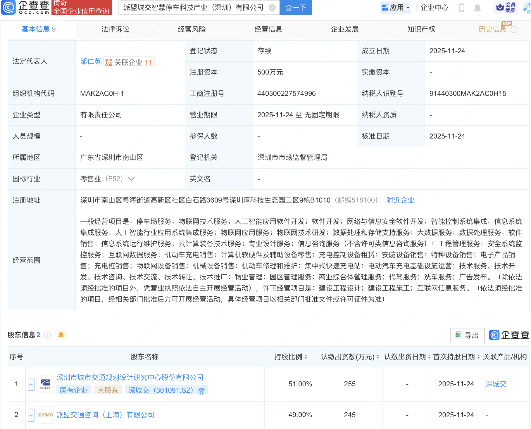 企查查APP显示,近日,派盟城交智慧停车科技产业(深圳)有限公司成立,经营范围包含:物联网技术服务;人工智能应用软件开发;人工智能行业应用系统集成服务;物联网应用服务等。企查查股权穿透显示,该公司由深城交(301091)等共同持股。
