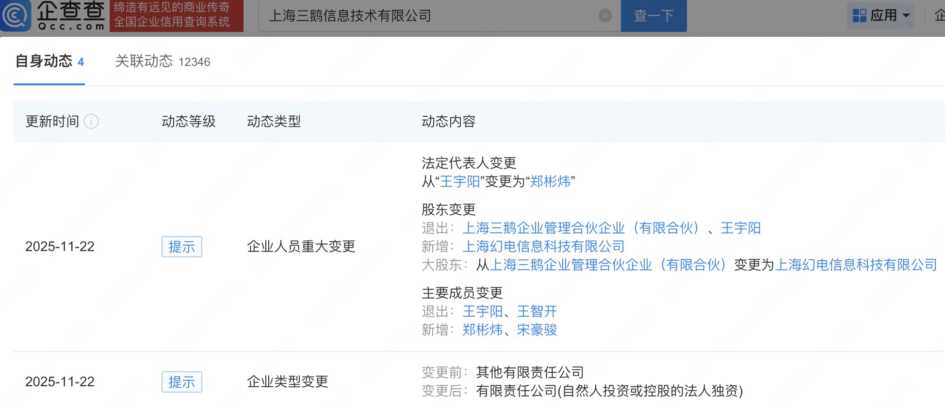 企查查APP显示,近日,上海三鹅信息技术有限公司发生工商变更,原股东上海三鹅企业管理合伙企业(有限合伙)、王宇阳退出,新增B站关联公司上海幻电信息科技有限公司为全资股东。企查查信息显示,该公司成立于2020年,经营范围包含:信息、计算机科技领域内的技术咨询、技术开发、技术转让和技术服务等。