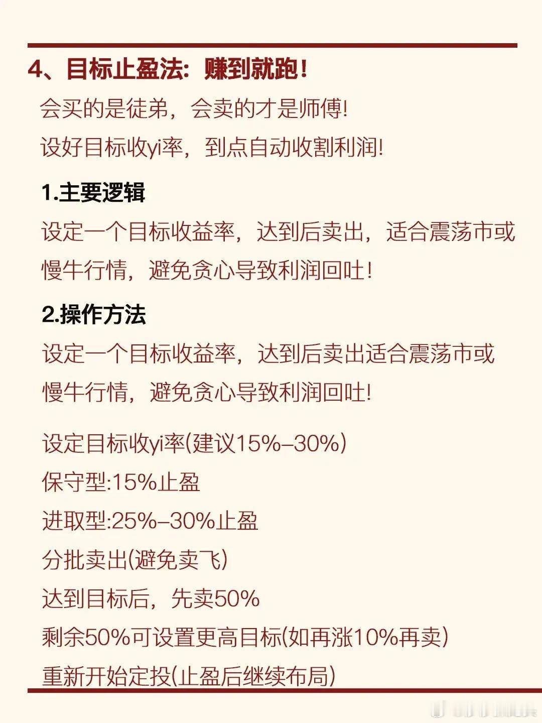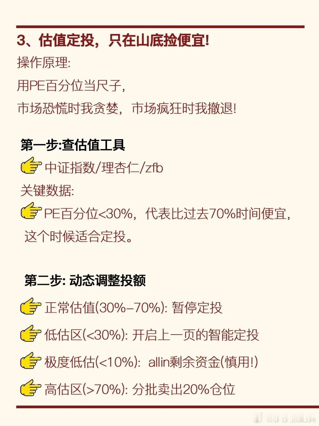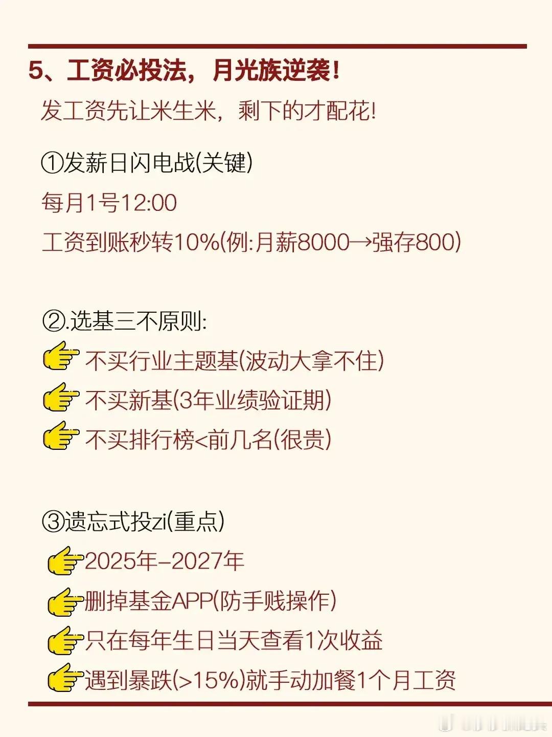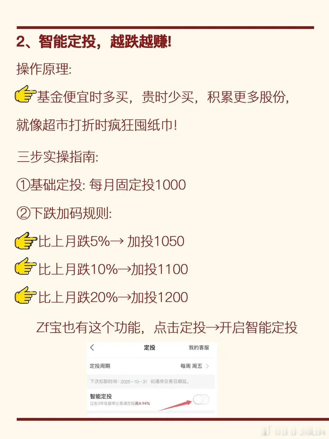定投5年翻倍实操:15个核心技巧,少走90%的弯路32岁上班族小林,月投800元坚持5年,账户最终突破12万元。看似普通的定投背后,藏着普通人难以察觉的实操逻辑。定投前必须储备3-6个月生活费,存入货币基金作为应急资金。张先生2022年因突发失业,被迫在基金大跌时赎回定投份额,亏损15%后错过后续反弹,应急资金的缺失让前期积累付诸东流。定投金额按“月结余×20%-30%”设定更合理。月薪1万元、月结余4000元的人群,每月定投800-1200元,既能保证投入力度,又不影响日常消费质量。基金组合优选“沪深300指数基金+纳斯达克100指数基金”,比例保持1:1。前者覆盖A股核心资产,后者捕捉全球科技红利,两者波动互补,降低单一市场风险。三类基金坚决避开:行业主题基波动剧烈,普通投资者难以长期持有;新基金缺乏3年业绩验证,质地无法保障;排行榜前列基金多处于高位,追入易被套牢。定投频率选择每周四或周五更优。近10年A股周四、周五出现低位的概率达58%,每周定投比每月定投更能平滑波动,5年累计收益率平均高出3.2%。智能定投可放大收益,设置基础金额1000元。当月基金净值较上月下跌5%加投1050元,下跌10%加投1100元,下跌20%加投1200元。支付宝、微信均支持该功能,过去3年智能定投比普通定投收益率高4.94%。估值是定投的核心参考指标。通过中证指数网、理杏仁查询PE百分位,低于30%进入低估区,开启智能定投;30%-70%为正常估值,仅维持基础定投;高于70%进入高估区,分批卖出。某投资者2021年未看估值盲目定投沪深300,3年收益仅2%;2022年调整策略,严格按估值定投,两年内收益率提升至18%,估值判断直接影响最终收益。每半年进行一次组合动态平衡。若沪深300仓位因上涨升至60%,卖出部分份额补入纳斯达克100,将比例拉回1:1,避免单一资产过度集中。基金分红选择“红利再投资”。无需手续费即可自动增加份额,某沪深300指数基金5年分红再投比现金分红多赚12%,复利效应显著。止盈采用分批执行策略。保守型设15%止盈线,进取型设25%-30%,达到目标后先卖50%,剩余50%若再涨10%全部卖出,随后重新开启定投。牛市阶段主动降低定投金额30%,熊市阶段提高50%。2015年牛市顶峰减少投入的投资者,避开了后续大跌;2018年熊市加大投入,低位积累了大量廉价筹码。新组合先小额试投3个月。每月投500元观察基金波动与自身适配度,若期间最大回撤超过20%,及时调整基金标的,避免盲目加大金额后陷入被动。优先选择费率0.15%以下的指数基金,利用平台费率折扣日扣款。每年定投1.2万元,低费率基金比费率0.5%的基金节省420元手续费,5年累计节省2100元。每年12月进行定投复盘。若某只基金连续2年跑输同类平均收益率,果断更换标的;若整体组合收益率未达预期,调整定投金额或频率。设定“20%最大可承受亏损线”,跌破后坚决不割肉。定投的核心逻辑是时间换空间,短期波动是正常现象,盲目割肉会让之前的投入前功尽弃。定投的本质是“纪律+策略”的结合。没有一成不变的方法,只有贴合自身情况、紧跟市场节奏的实操逻辑。刚入门的投资者不必追求复杂策略,先从“应急资金+核心组合+智能定投”起步,逐步优化调整。坚持长期主义,避开追涨杀跌的误区,定投终将成为普通人积累财富的可靠路径。