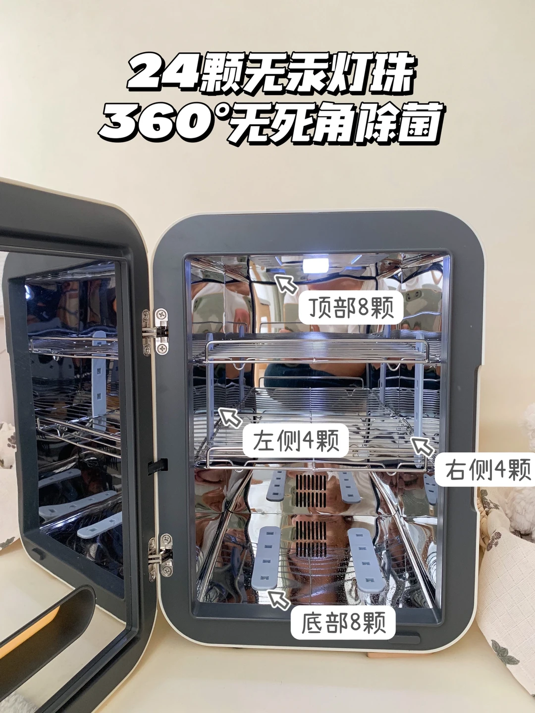 🔍在杀菌数量和效果这一块儿,它的实力就很能打啦!不仅有纳米水离子杀菌,配备了24颗uvc独立无汞灯珠,可以全方位消毒杀🦠,不留死角!而且宝宝的奶瓶和奶嘴长时间消毒,也不会发黄发硬!