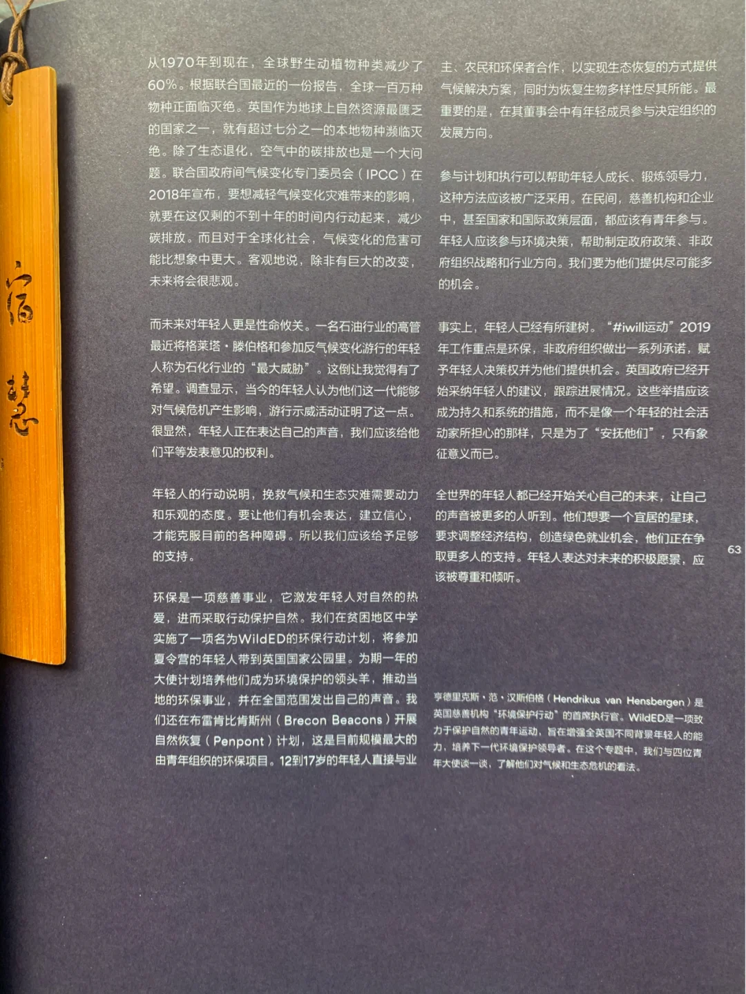 每个人都能贡献一份力量。我们生活的时代要求人人都成为环保主义者。通过个人的贡献,在全球范围动员大家集体行动,才能解决当今世界面临的最紧迫的问题。