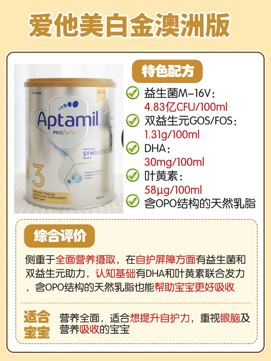 ✅认知基础:添加了30mg/100ml的DHA搭配优量叶黄素,帮助宝宝的更好的助力认知发育!1岁前是宝宝认知发育冲刺期,需额外注意认知营养的补充,尤其是DHA这种成分是越早越好且要注意摄入足量,早阶宝宝每天需摄入不低于100mg的DHA噢,爱他美白金澳洲版中所含的DHA轻松满足,不需要再额外补充补剂~