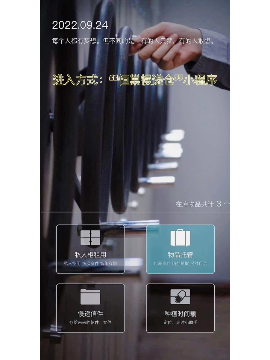 🎊你可将生活、学习、工作、情感等各方面的实物,以慢递的形式,交由“恒巢慢递仓”代为托管,并在指定的时间或条件,发送给你或你指定的联系人,达到穿越时空的震撼效果。