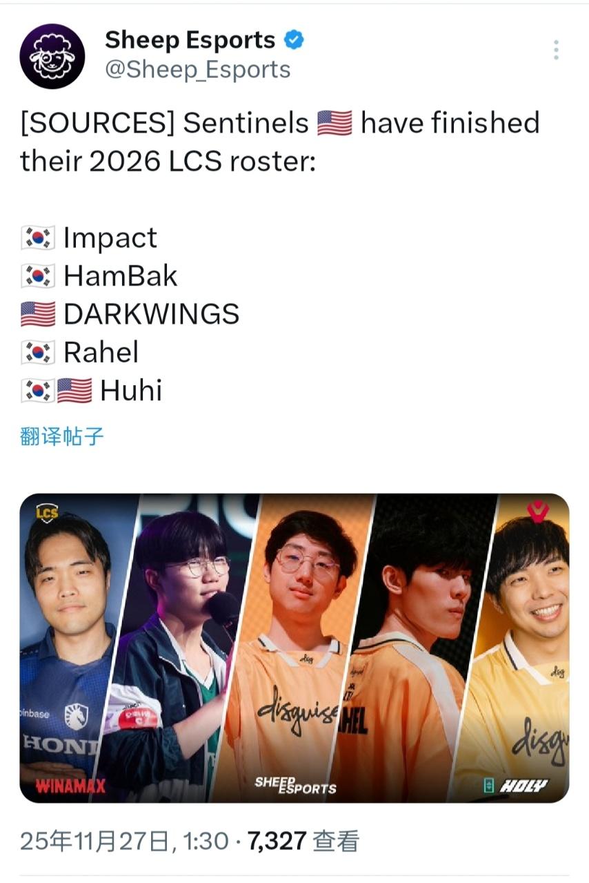 虎扑11月27日讯外媒爆料明年代替100T的席位进军LCS的SEN的阵容为: