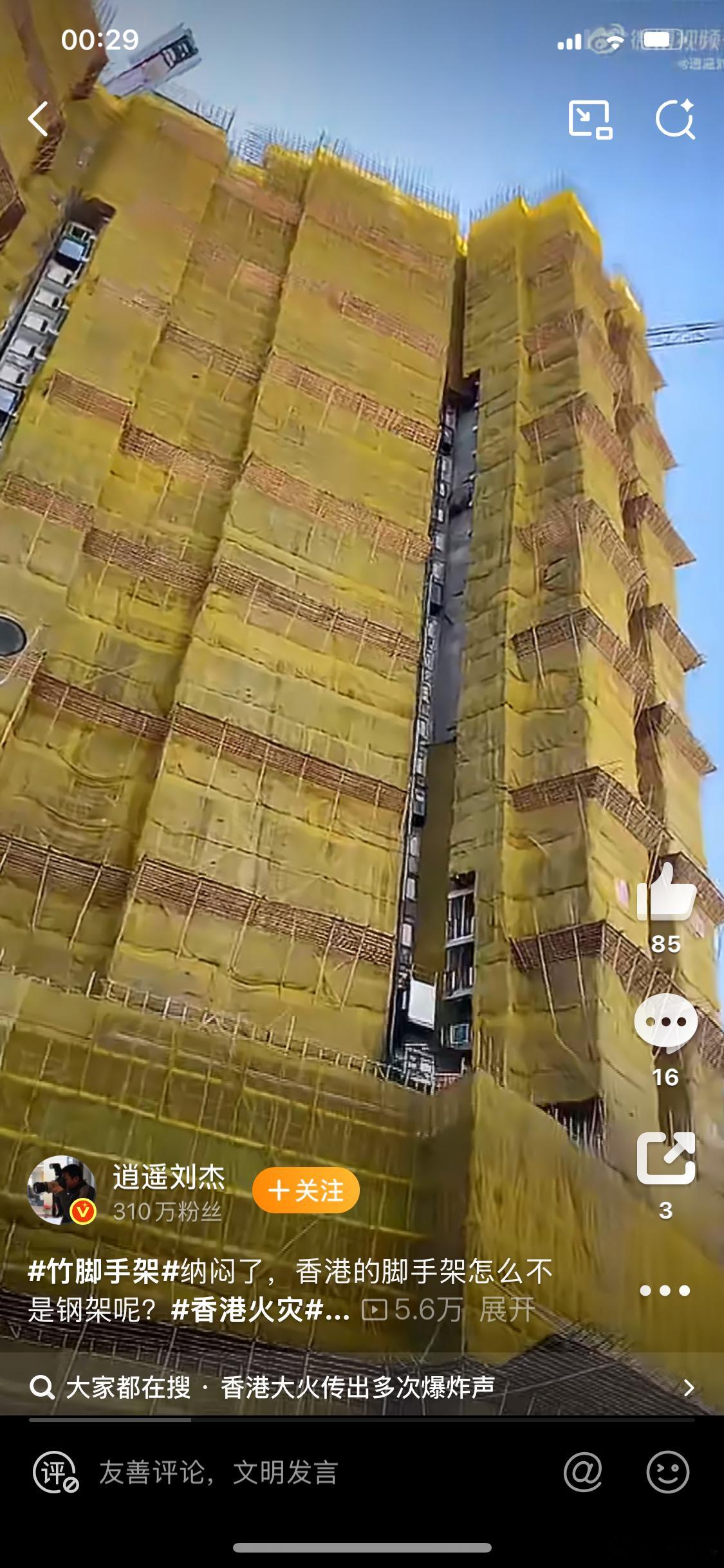香港火灾看到香港大火的消息,满心都是揪心与悲痛。不禁回想起1996年香港嘉利大厦那场大火,当年的伤痛还未消散,如今类似的悲剧却再度上演,实在是印证了“人们从未在历史中吸取过任何教训”这句话。这次大火由竹制脚架引发,火势迅速蔓延。有专家分析,火势如此猛烈,或许与强风助长、棚网未用阻燃物料、棚架上堆放杂物等因素有关,常见火源可能是未熄灭的烟头,或是烧焊、打磨时产生的高温火屑 。香港地少人多,楼建得又高又密,房价更是高得惊人,许多地方可谓寸土寸金。在这样的环境下,火灾隐患被无形放大。密集的建筑布局、老旧建筑消防设施的不完善,都为火灾的发生和蔓延提供了可乘之机。就像此次出事的建筑,或许就存在着各种消防隐患,才让这场大火如此难以控制。而且高楼火灾扑救难度大,消防车高度达不到超高楼层,疏散人群也面临诸多挑战,任何一个小的疏忽都可能酿成大祸。真心希望这场香港大火能尽快扑灭,不要再有伤亡,安全永远是第一位的,愿所有人都能平平安安🙏 香港火灾