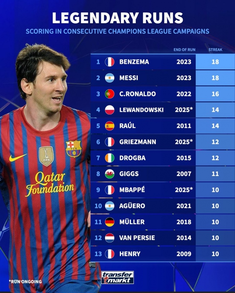 直播吧11月27日讯《转会市场》统计了欧冠历史赛季连续进球情况,梅西和本泽马并列居首。