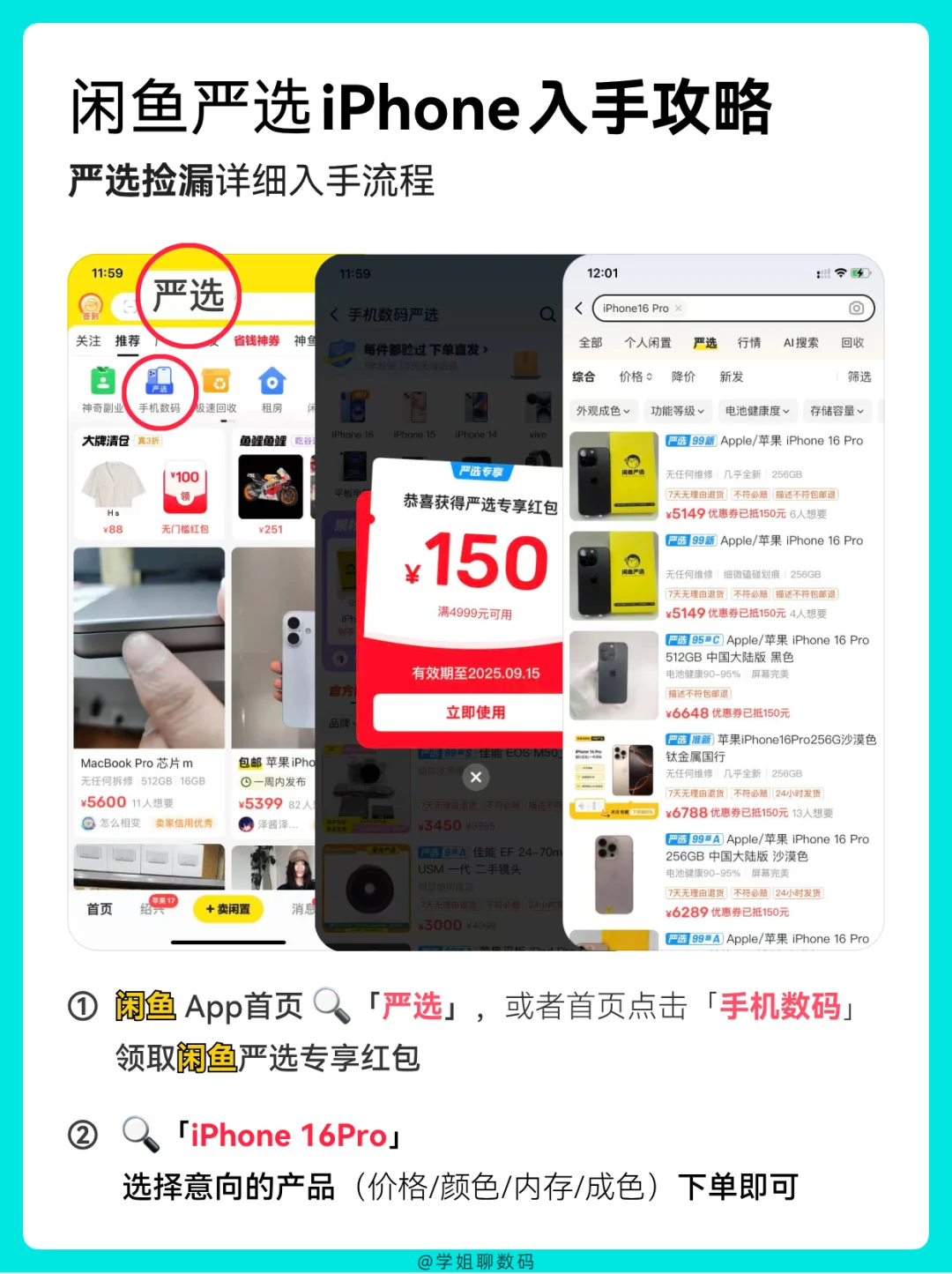 近期闲鱼🐟推出了「闲鱼严选」版块,严选的每件产品都经过了专业验机,售后也都有保障。现在入手⼆⼿机可以享受7天⽆理由退货和1年质保,还可以领取⾄⾼150立减红包,iPhone 16Pro入手只要5149!现在苹果新机iPhone17系列刚发布,其他机型纷纷都降价了,有需要的宝子闲鱼搜「严选」或闲鱼首页点击「手机数码」直达严选会场捡漏~