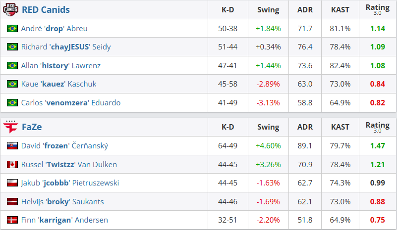 图一FaZe选择Mirage,但进攻乏力仅拿3分,以7-13先行告负。图二RED选择Nuke,巴西队在上半场进攻拿到六分的情况下,被FaZe拖进加时,最终历经双加时苦战,frozen单图轰下39杀和1.96Rating,FaZe以19-17艰难扳回一城。
