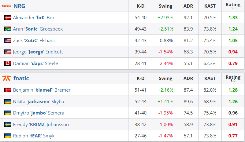 图一fnatic选择Mirage,但是全员哑火,以3-13光速落败。图二NRG选择Inferno,fnatic立足防守建立起半场8-4的领先,凭借blameF和jackasmo双人发力,以13-10强势扳回一城。