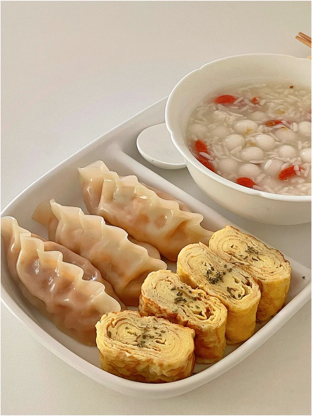 超爱这种简单又快手的早餐~ 久违的厚蛋烧选手来啦! 酒酿小圆子浇上桂花蜜,搭配蒸饺 好满足呀呜呜呜~👍 - 今天的蒸饺是我冰箱里的老选手了[偷笑R] 当当当 那就是必品阁王饺子🥟 最近在减脂的我爱上了他们家新出的植物肉王饺子~ 这款饺子高蛋白,低热量… 既满足了我的减脂需求,又照顾到我的味蕾 简直不要太幸福了! - 偷偷告诉你们这款饺子是 0胆固醇0反式脂肪酸 蒸,煮,煎...…都可以! 懒人必备啊!!![赞R]