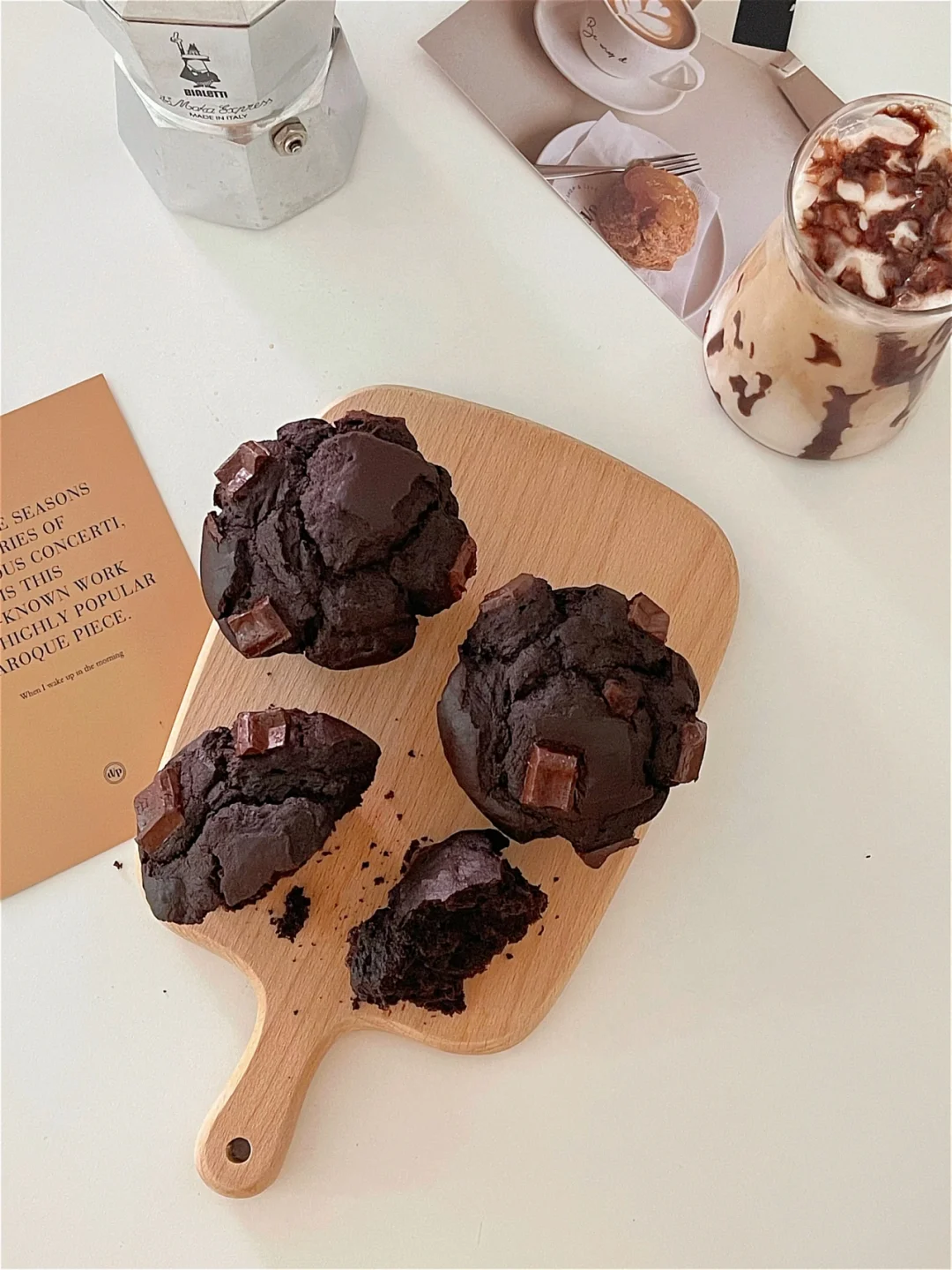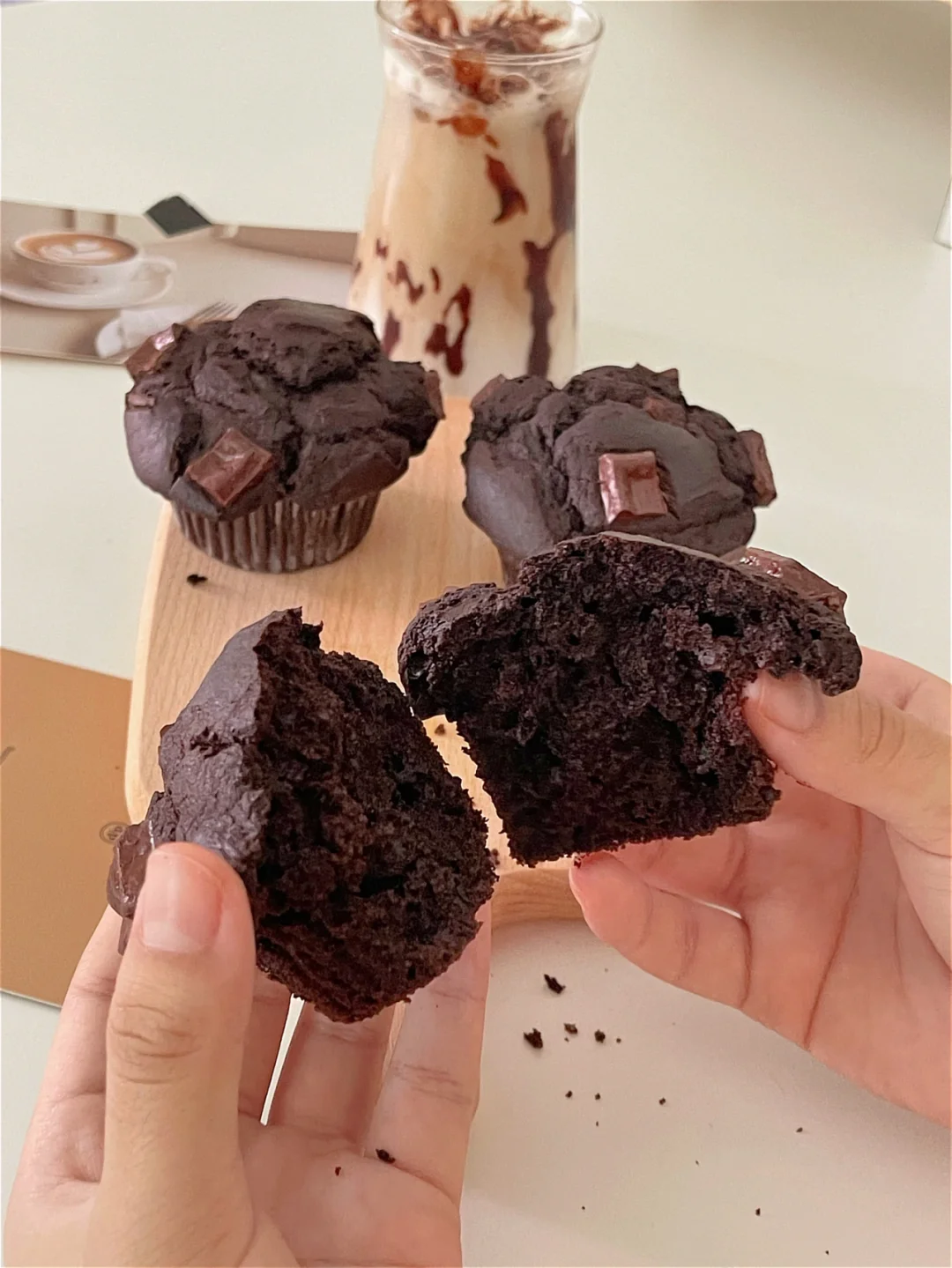 玉米油45g、牛奶70g、鸡蛋1个、糖30g、低筋面粉55g、玉米淀粉15g、泡打粉5g、可可粉20g、奶粉15g、盐2g、适量巧克力块