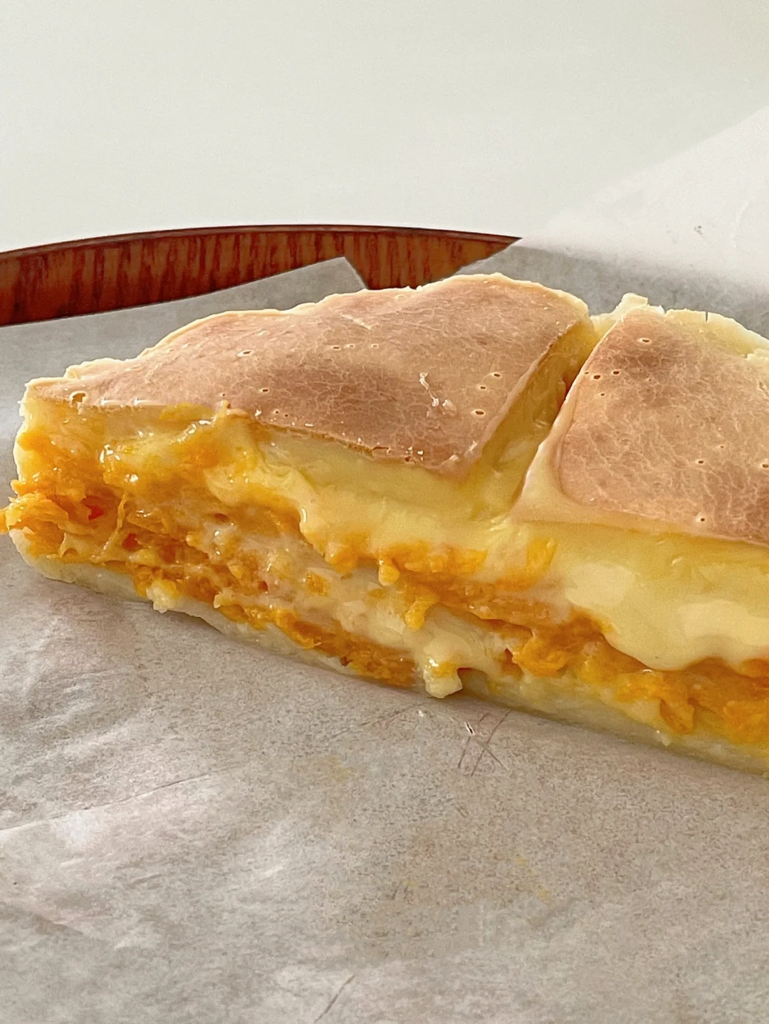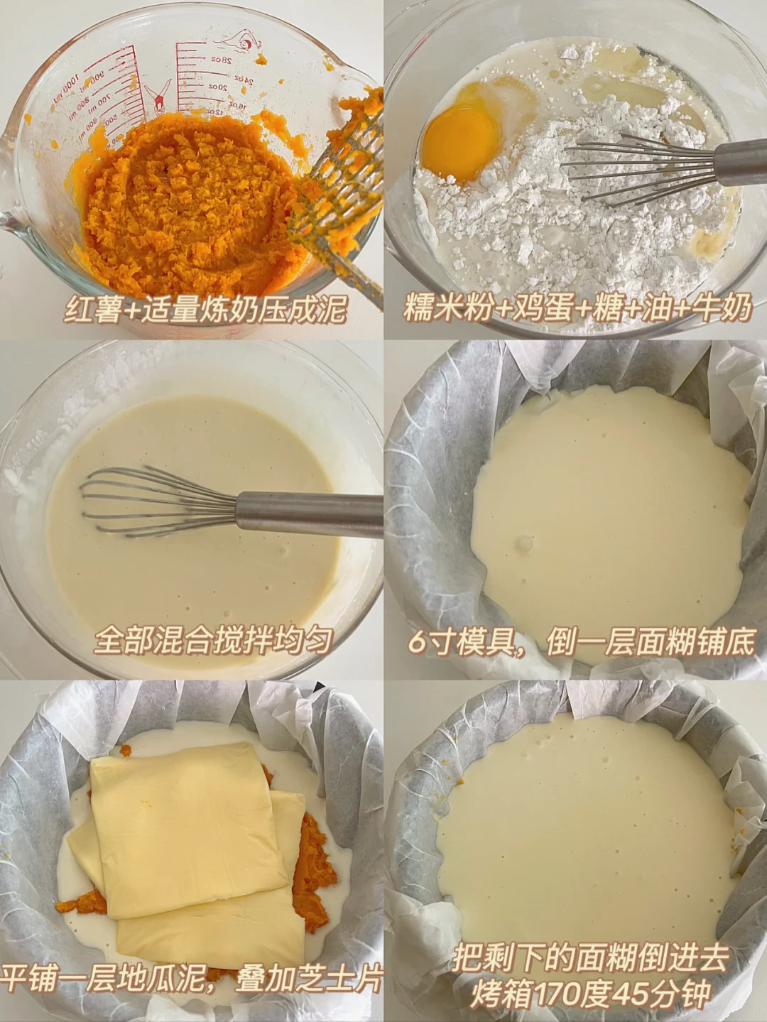 4️⃣铺上红薯泥,3片芝士片,然后倒入剩下的面糊