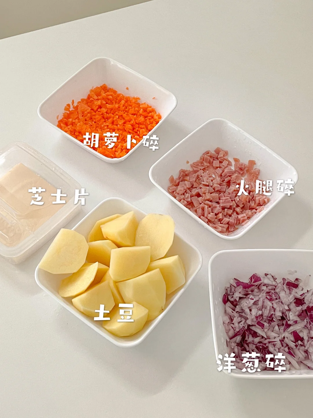 拿出饭团模具,挖一勺土豆泥 放上一点芝士片