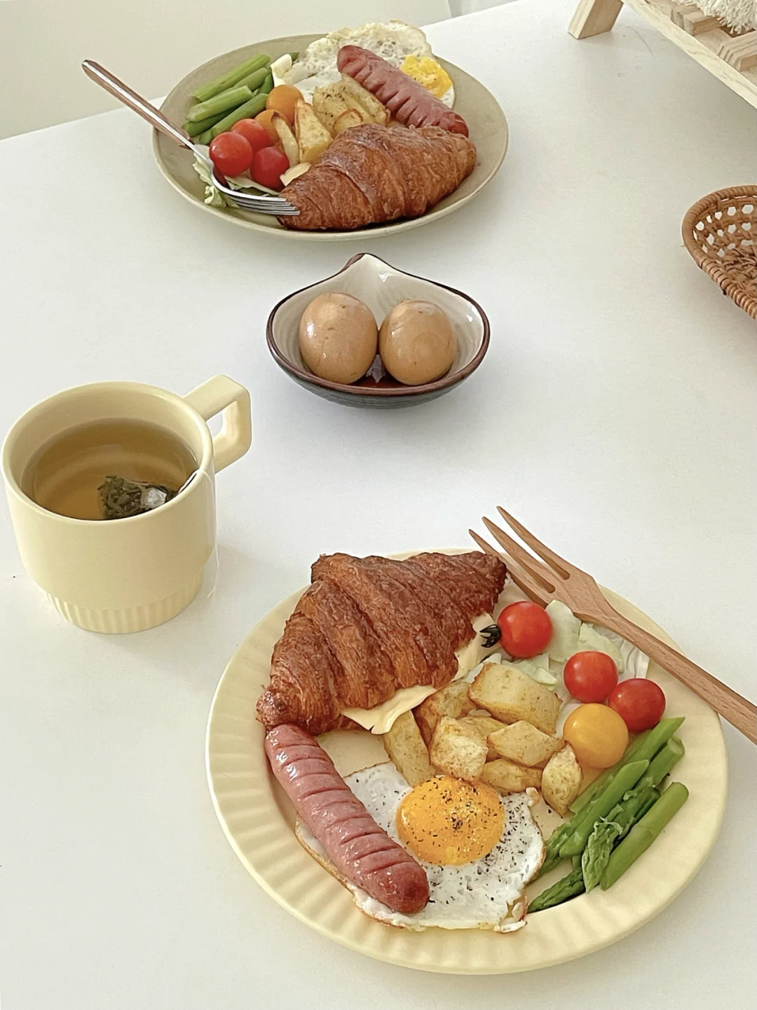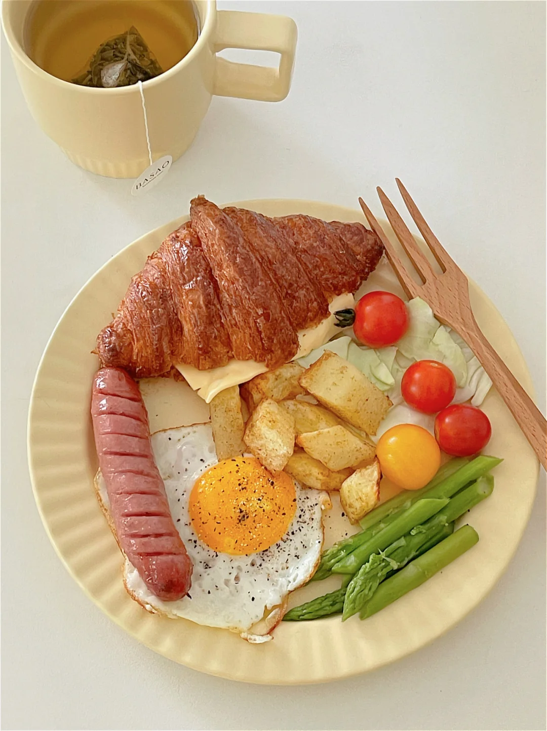 -茉莉乌龙茶 肉肠 薯角 小番茄 芦笋 煎蛋 可颂