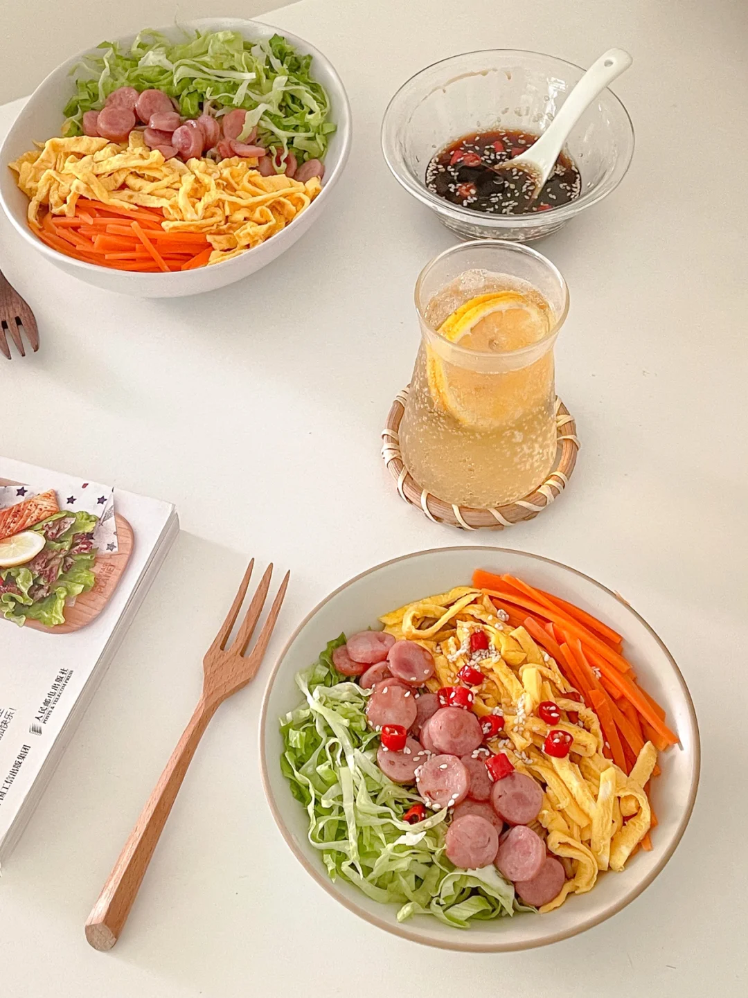 9.20 brunch|照例打个嗝[害羞R] 今日份两人食 喝的是柠檬乌龙茶🍋 满足+11111 节日快乐,假期愉快呀宝宝们~ 今日分享一个快手荞麦拌面 好吃快手高颜值[哇R] -原材料见图三 酱汁:2勺生抽+1勺陈醋+1勺蚝油+ 1勺香油+2勺半的清水+最后加入1勺白芝麻和小米辣 所有食材切完,胡萝卜焯水 最后全部码上荞麦面即可 最后倒上酱汁拌一拌就可以开吃啦[害羞R]