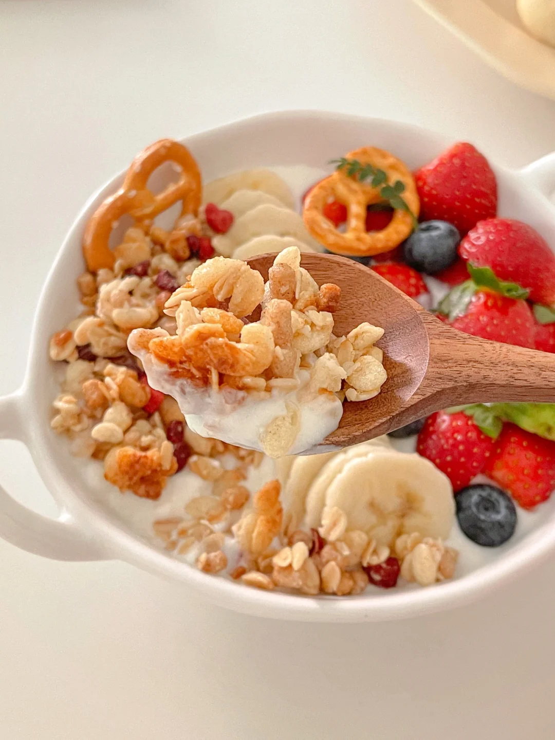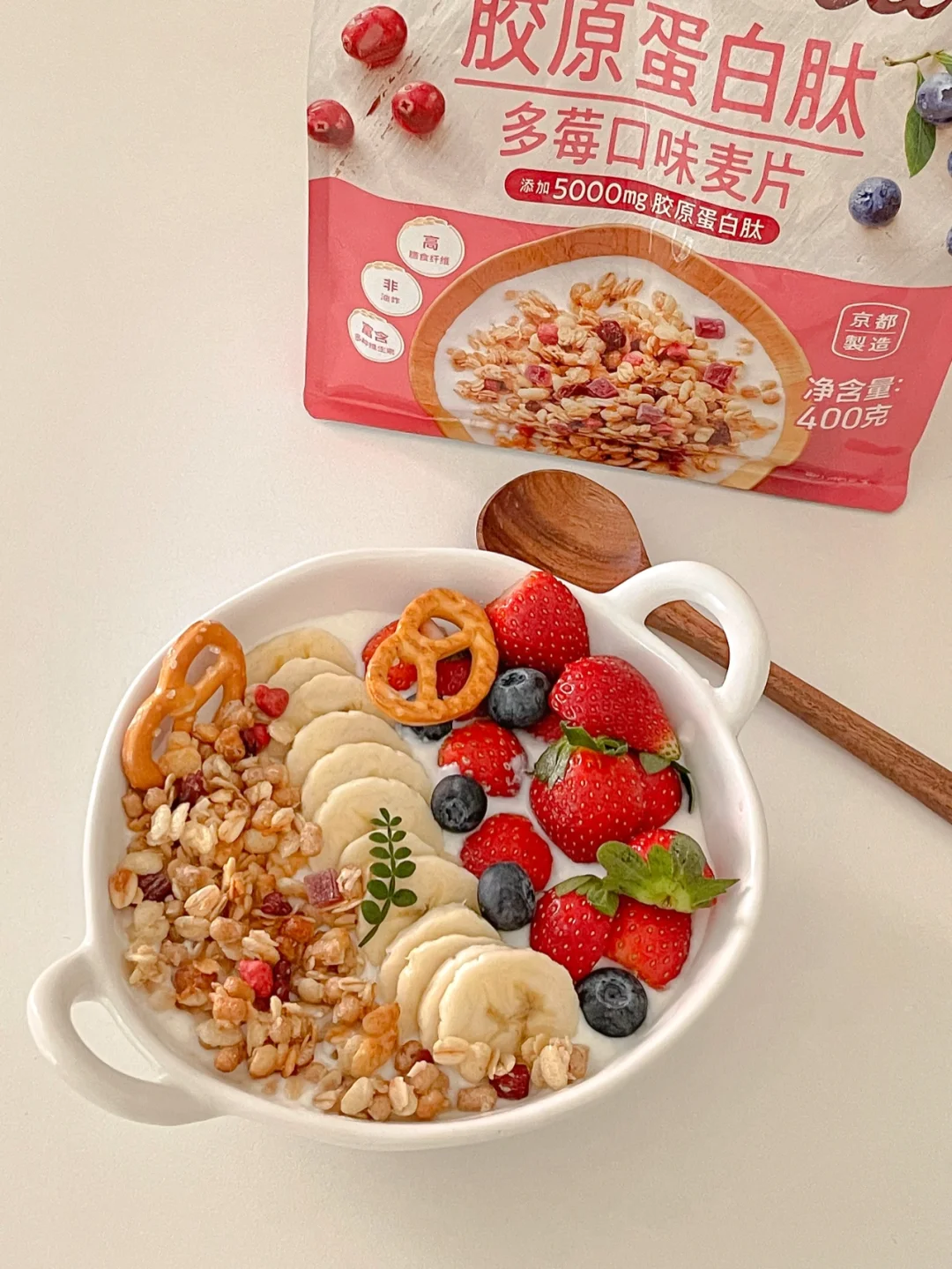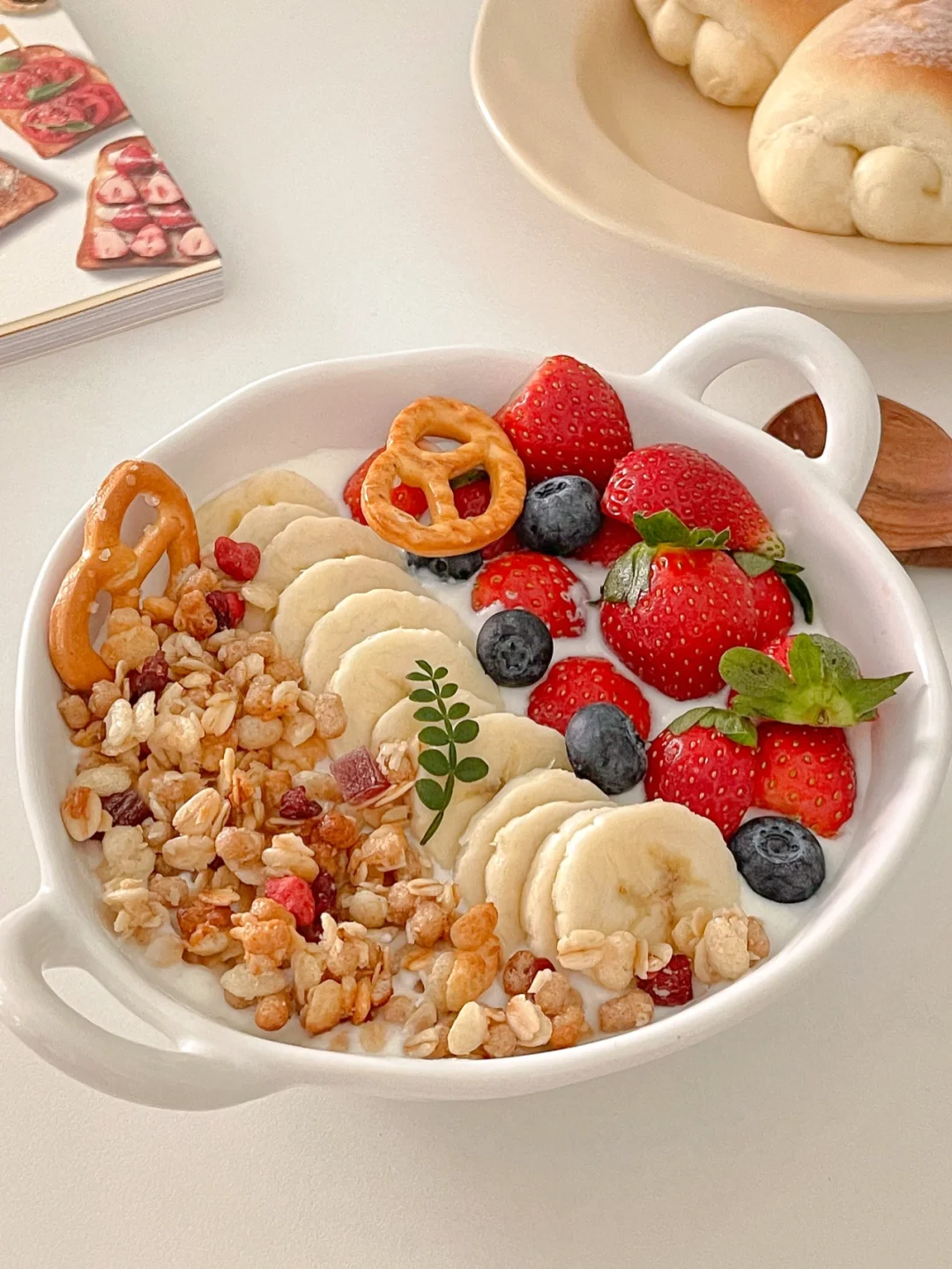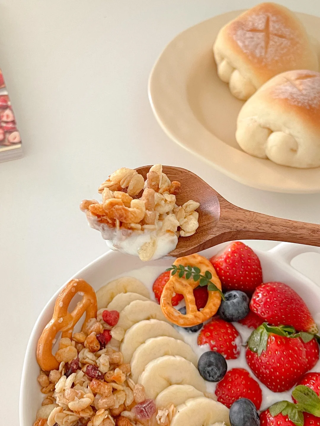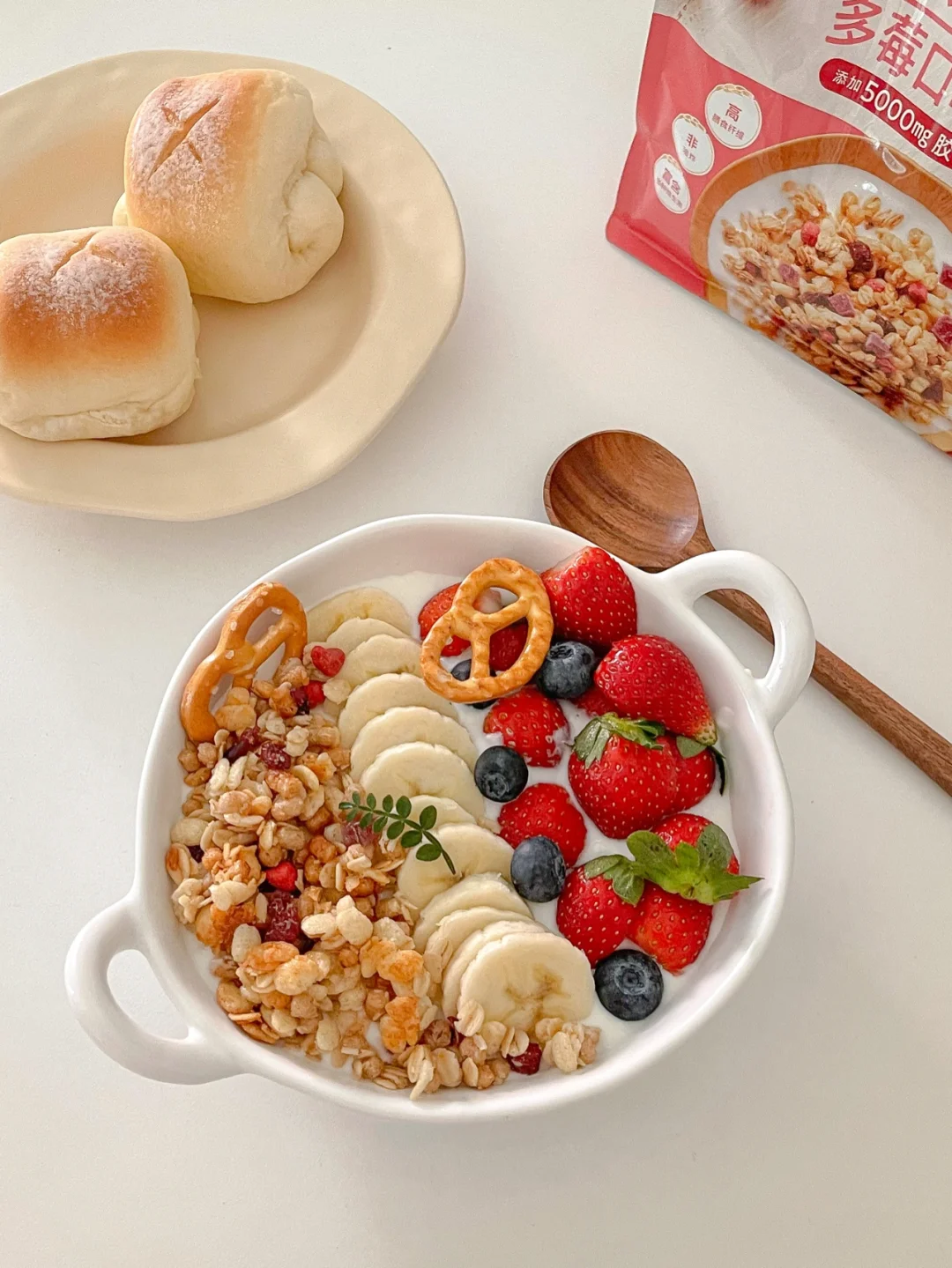 12.17🥣|又是喜欢的周五了[斜眼R] 今天是适合上班族的早餐~ 制作简单,无糖酸奶搭配水果无负担 香蕉,草莓加🈵️太好吃了[色色R] 麦片有三重莓味碰撞~ 蔓越莓,草莓,蓝莓口感超丰富。 卡乐比麦片酥酥脆脆的 还可以补充胶原蛋白 夸一夸自己做的云朵小餐包。 然后祝大家周五愉快[大笑R]