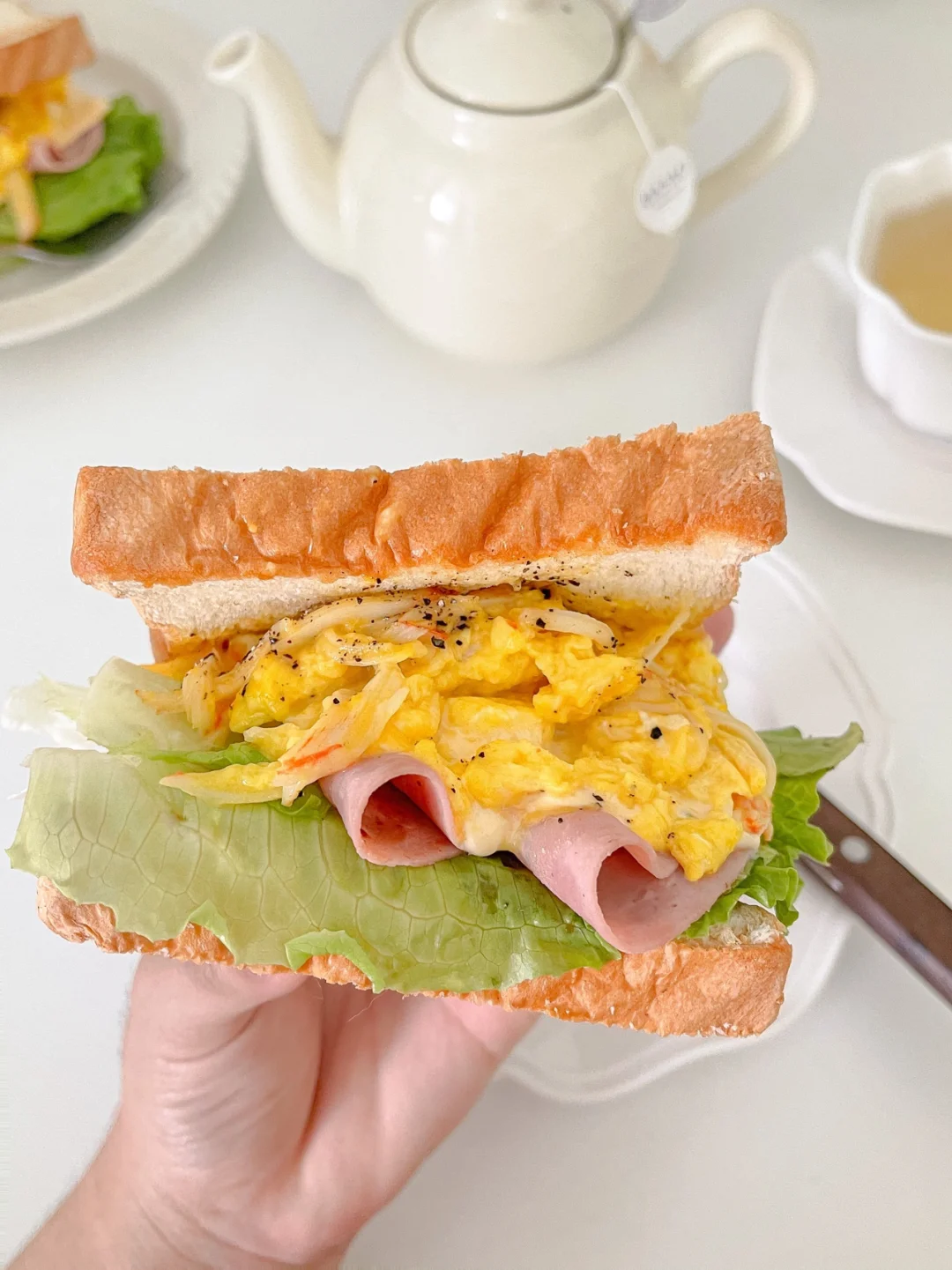 5.21早餐|今天是蟹柳滑蛋同学报道[大笑R] 满满的蟹柳肉太幸福了~ 最后在大快朵颐之前来了一张丑陋侧颜 -火腿片 生菜 蟹柳滑蛋 吐司 芝士片 乌龙茶[大笑R] 早安[派对R]元气满满的一天🔛